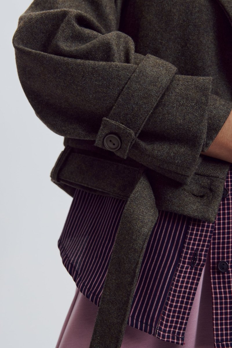 This cropped tweed jacket by Eve Gravel combines the look of a classic moto-jacket with a soft modern twist. Its refined, subtle tweed weave adds texture and sophistication to every detail. The cropped cut flatters the silhouette, while the waist belt allows for a perfect fit and accentuates the shape. The sleeves are adorned with a band and button, offering the option to adjust the look to your preference. The matching buttons, both chic and functional, complete the design. Perfect for elevating both day and evening outfits, this timeless jacket will become a staple in your wardrobe, accompanying you season after season.