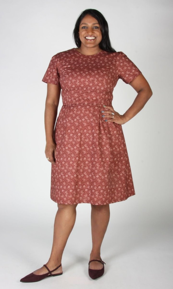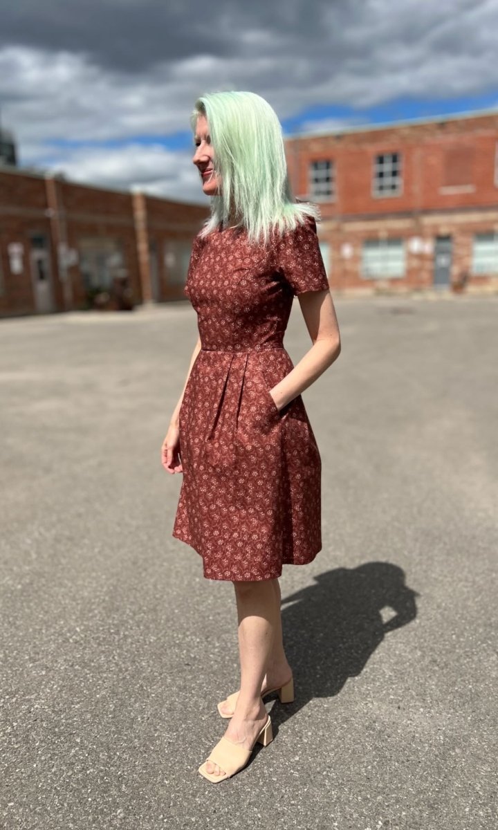 Birds of North America's Buttonquail Dress is back this season after its debut last fall when it became an instant classic! The Buttonquail is an easy-to-wear short-sleeve top and knee-length pleated skirt with an invisible back zipper and side skirt pockets. This vintage inspired print Parlour has a deep, brick red background with delicate, cream coloured leafy sprays.