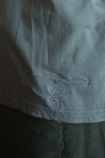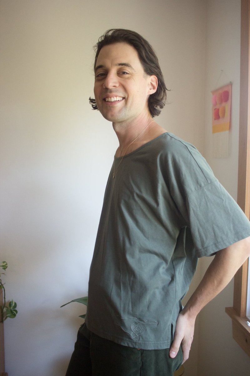 The Virgo top by Jennifer Glasgow is a lovely oversized t-shirt made from the softest organic cotton. It features a rounded bias finished neckline and cover stitched hems. There are little slits on the sides as well as the seasonal embroidery “Always to the Left” hand stitched into the bottom left corner with tone-on-tone thread.