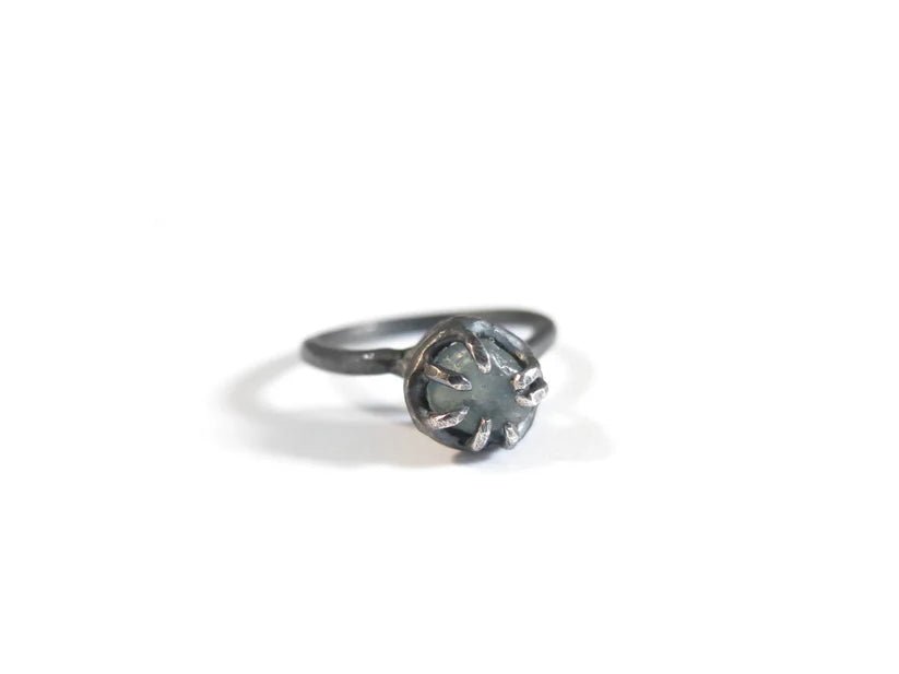 A one of a kind ring by Elaine Ho featuring a rough Montana sapphire cast in sterling silver with a textured oxidized finish. The oxidized silver will evolve and become brighter and shinier with wear.