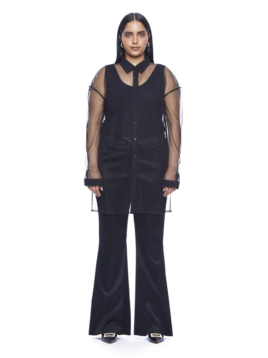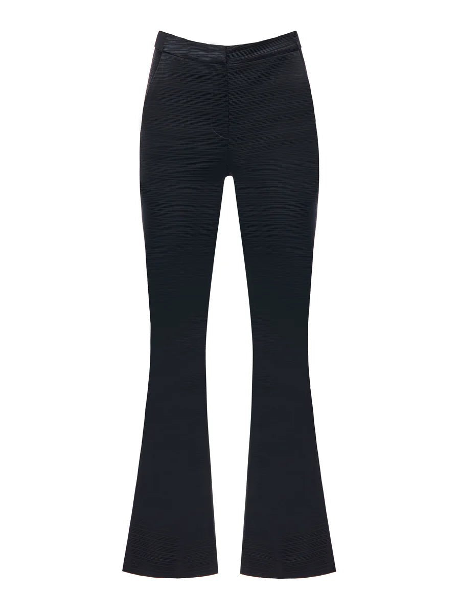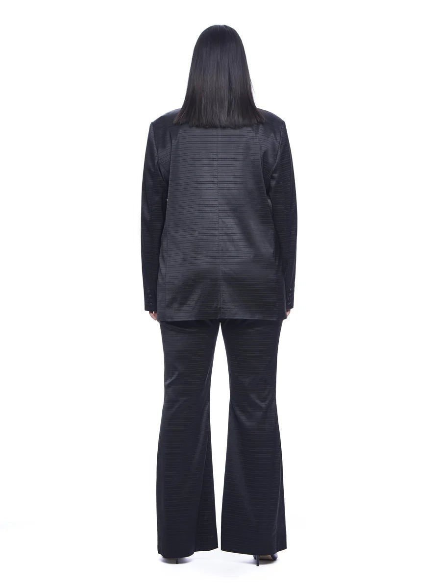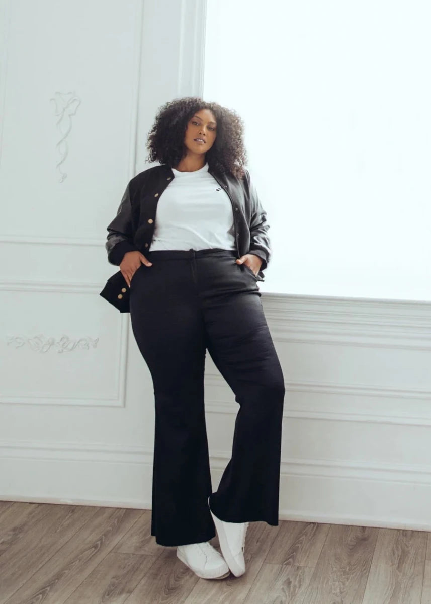 The Flared Hem Pants by Hilary MacMillian take themselves seriously but are oh so comfortable! These pants offer a high end tailored fit with an ultra flattering flare leg, giving a nod to both the 70's and 90's. The high end Italian fabric lends itself to wear-all-day with a 2 way stretch which make this the prefect day to evening piece. This black pant is a step above the basic with a subtle horizontal grain which gives great texture to your look. The front waistband features a zipper fly and hook n' eye closure. We love it styled with a sneaker and t-shirt or more formally with a blouse and blazer