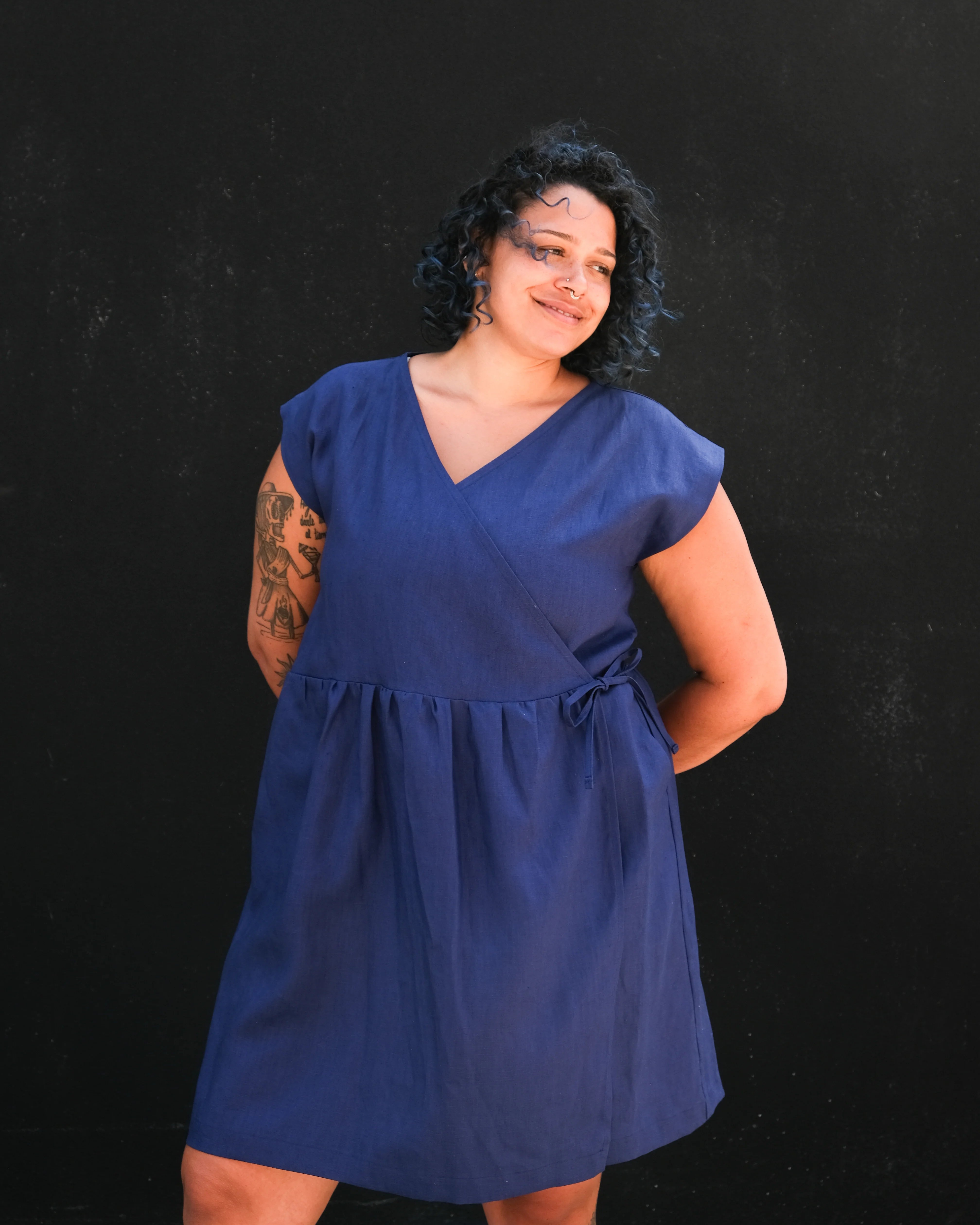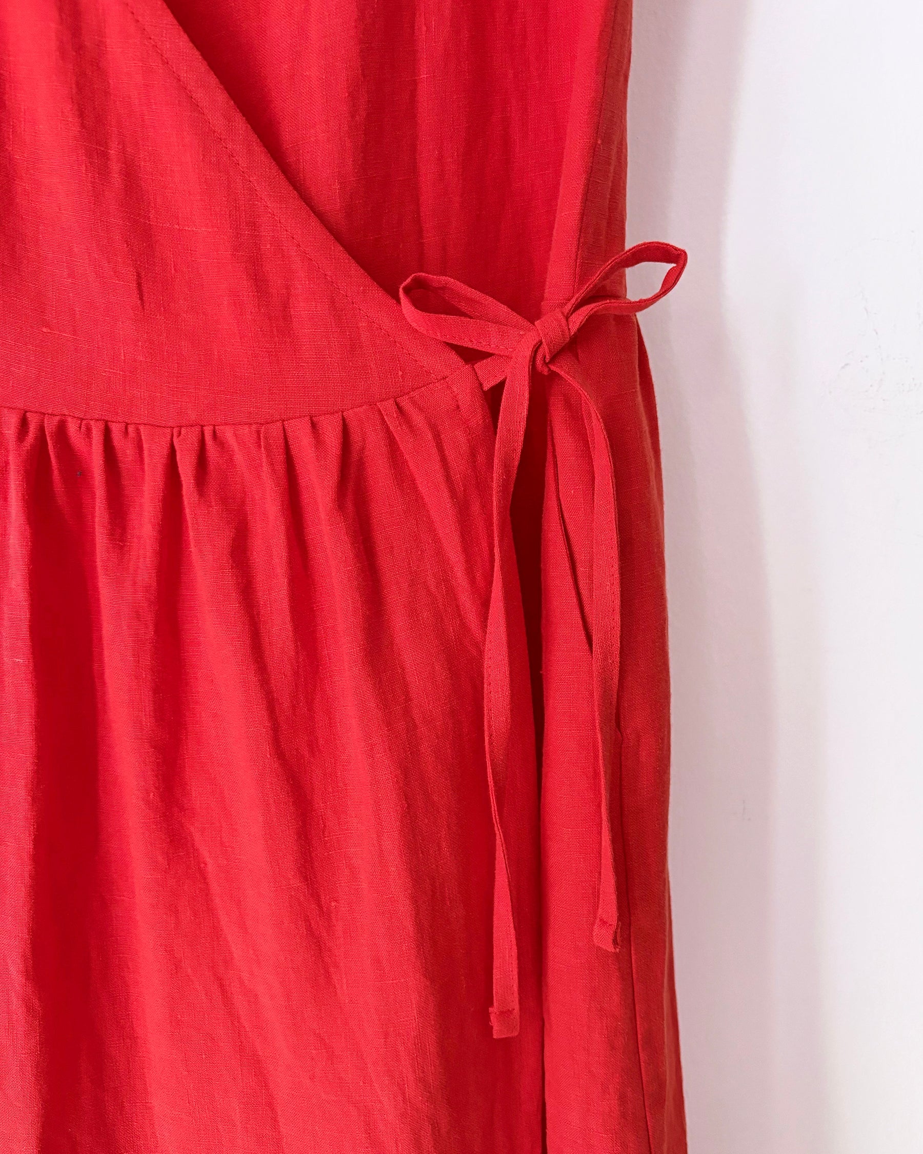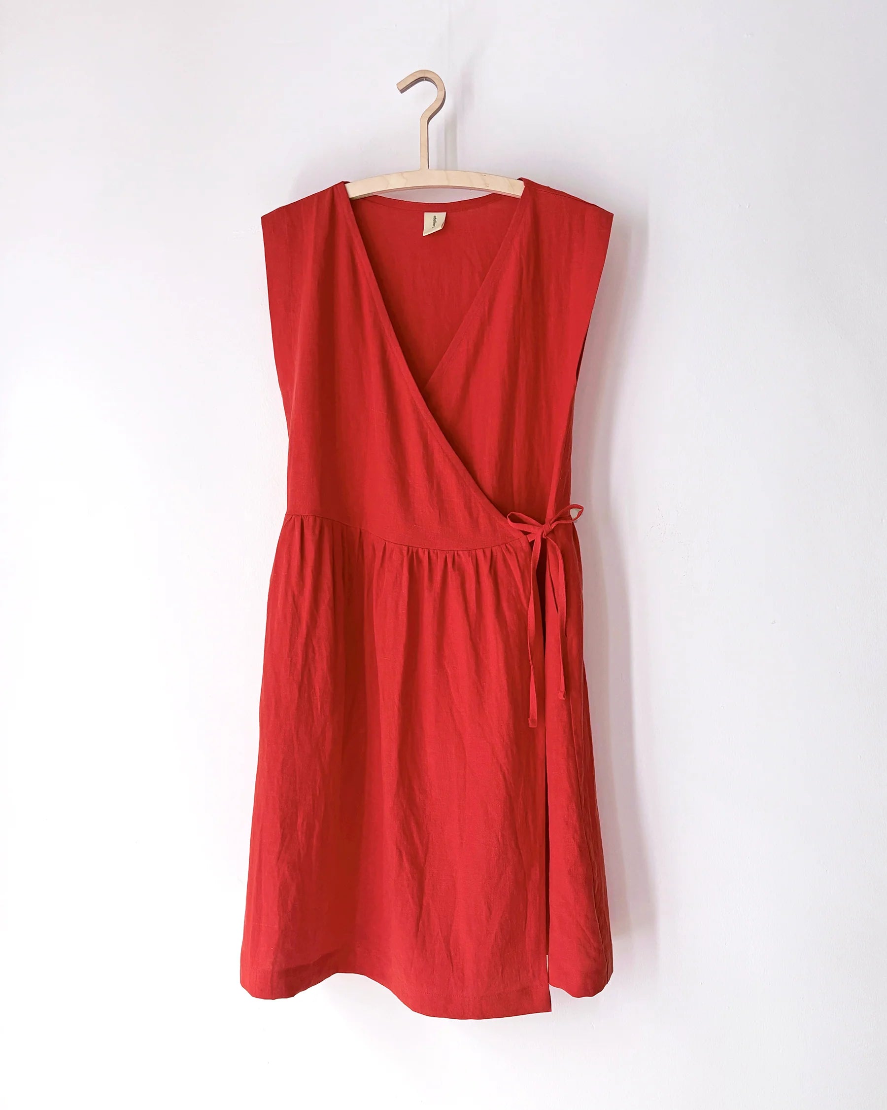 Atelier B's Pleated Dress has a loose fit that crosses at the front with ruching at the waist adds volume to the skirt. This linen version comes in two colours: midnight blue and cayenne. It is sleeveless, with a V-neckline that crosses at the front, bias fastenings on the inside and outside and slanted pockets on the sides. The hem is straight and just above the knee.