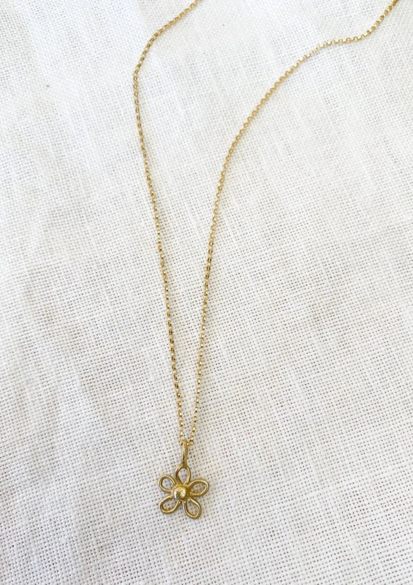 The Bloom Mini Necklace by Hawkly features a hand carved small flower cast in bronze or silver hanging from either a gold-fill or sterling silver chain.