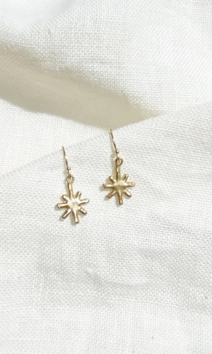 The Estrella Mini Earrings by Hawkly feature a tiny hand carved star burst cast in either sterling silver or bronze and hanging from hook style posts.