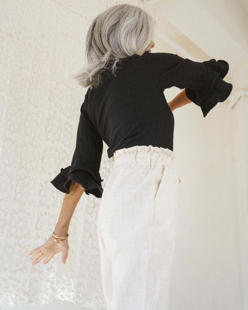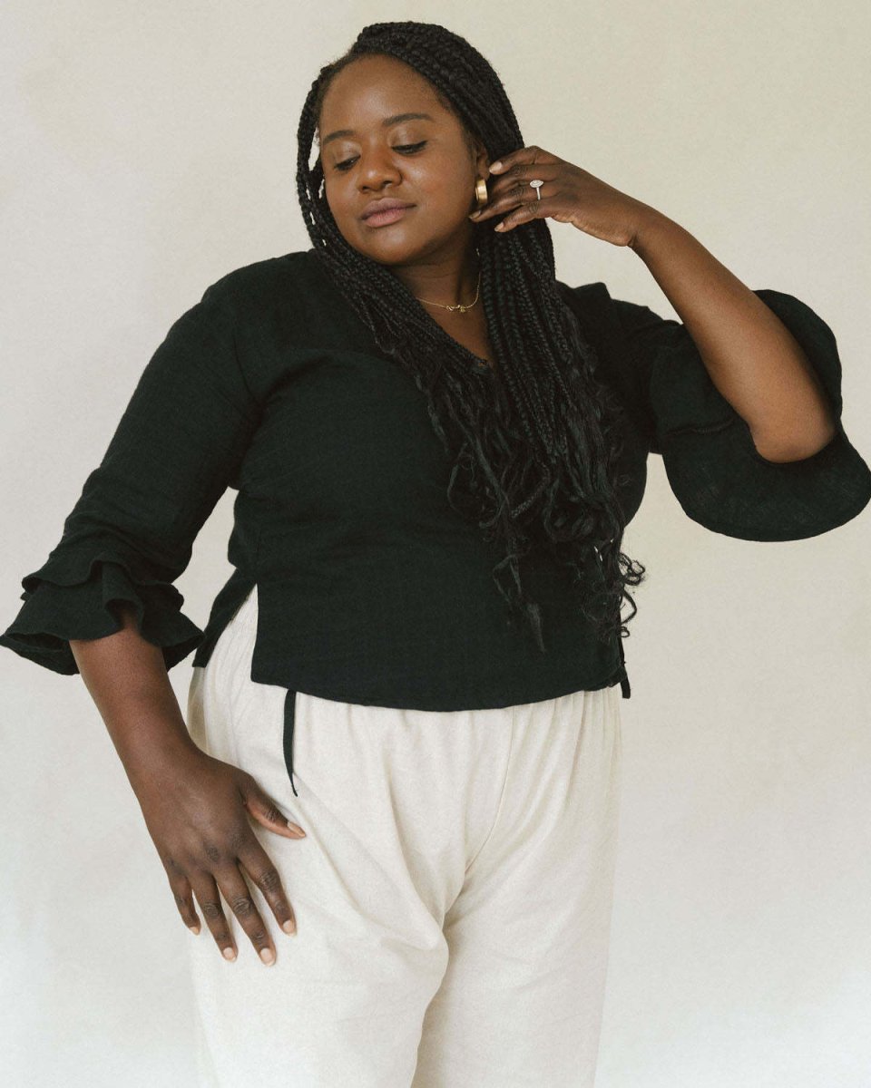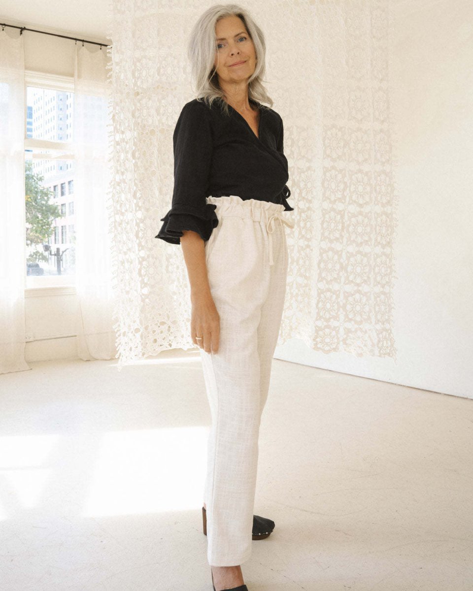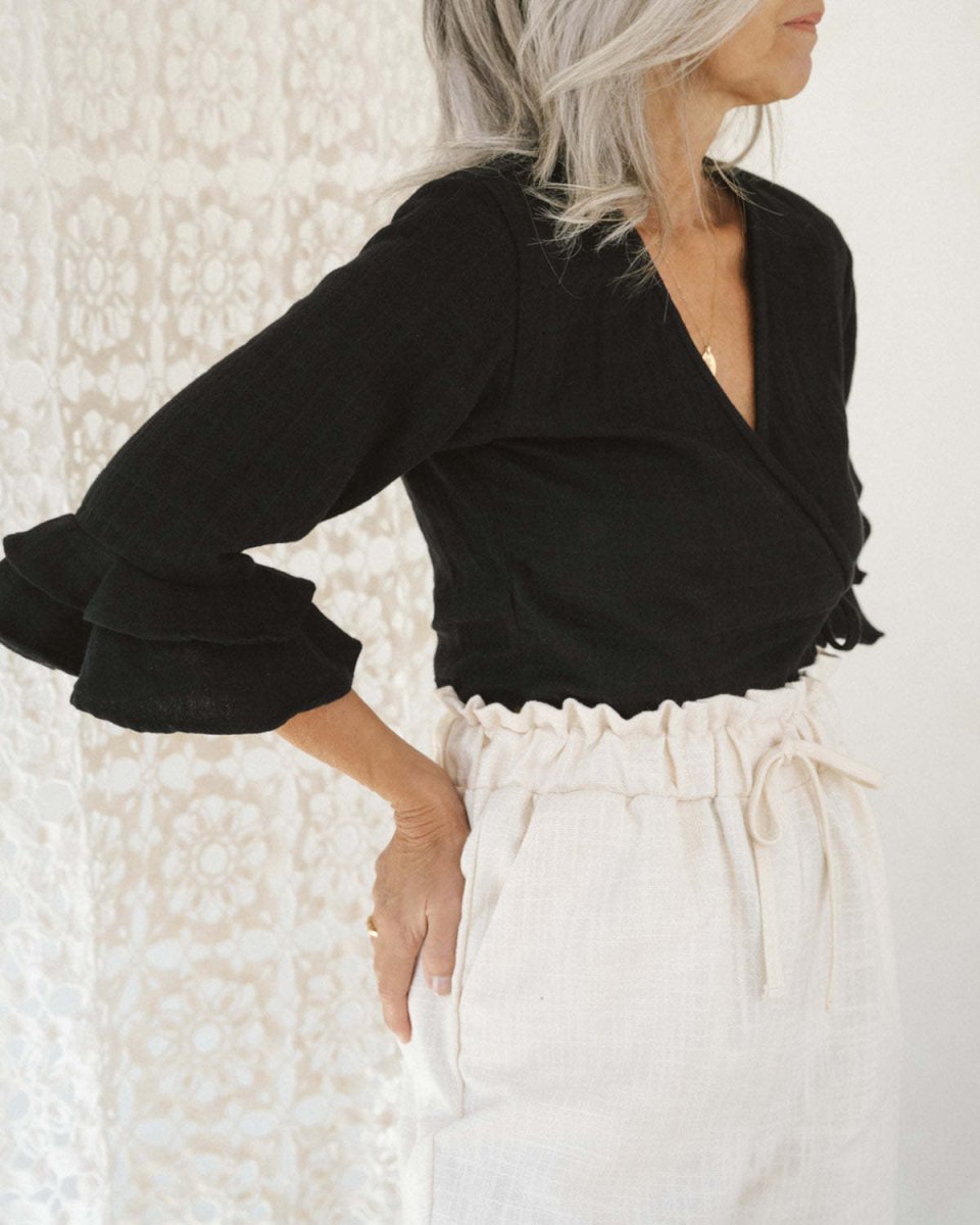 Inspired by a vintage find, Harly Jae created the Lolita Blouse. Featuring gorgeous 3/4 sleeves that end in a double layer ruffle and made from an organic gauze fabric that has a subtle check pattern, she is a fun take on a classic wrap blouse!