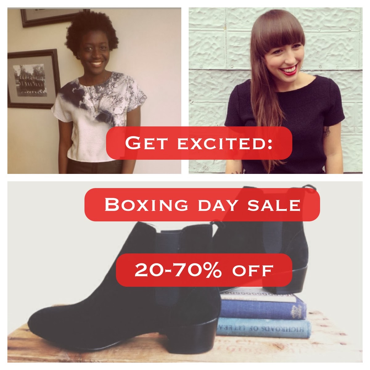 Nous serons ouverts de 10h à 18h dans les deux magasins le 26 décembre. Avec des vêtements réduits de 20 à 70 %, c'est votre chance de vous procurer un petit quelque chose en plus pour avoir été si bon cette année.