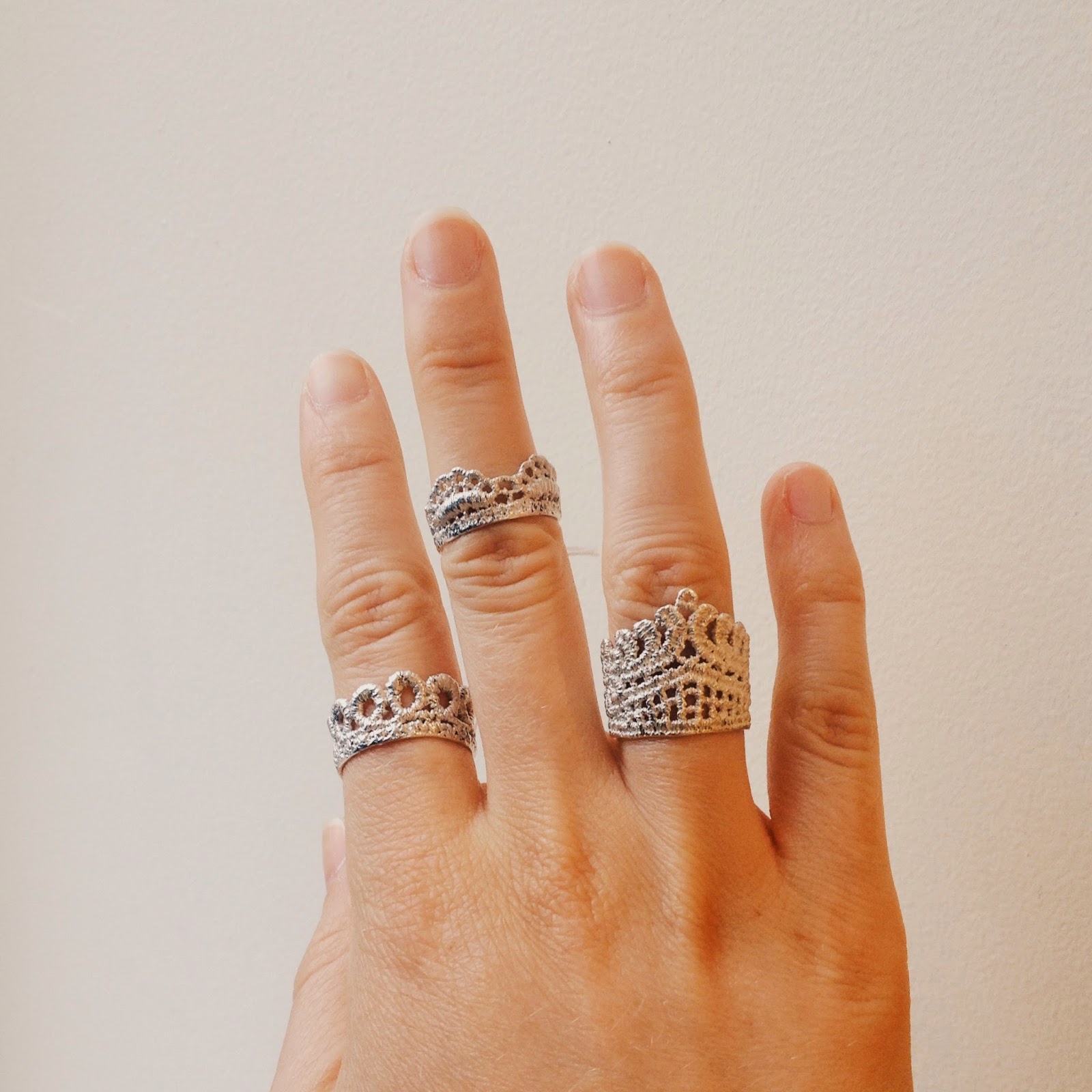 Et voici ses bagues classiques en dentelle argentée. Les bandes plus fines peuvent être empilées ou portées comme des bagues midi. Le style en forme de couronne est une magnifique pièce remarquable.
