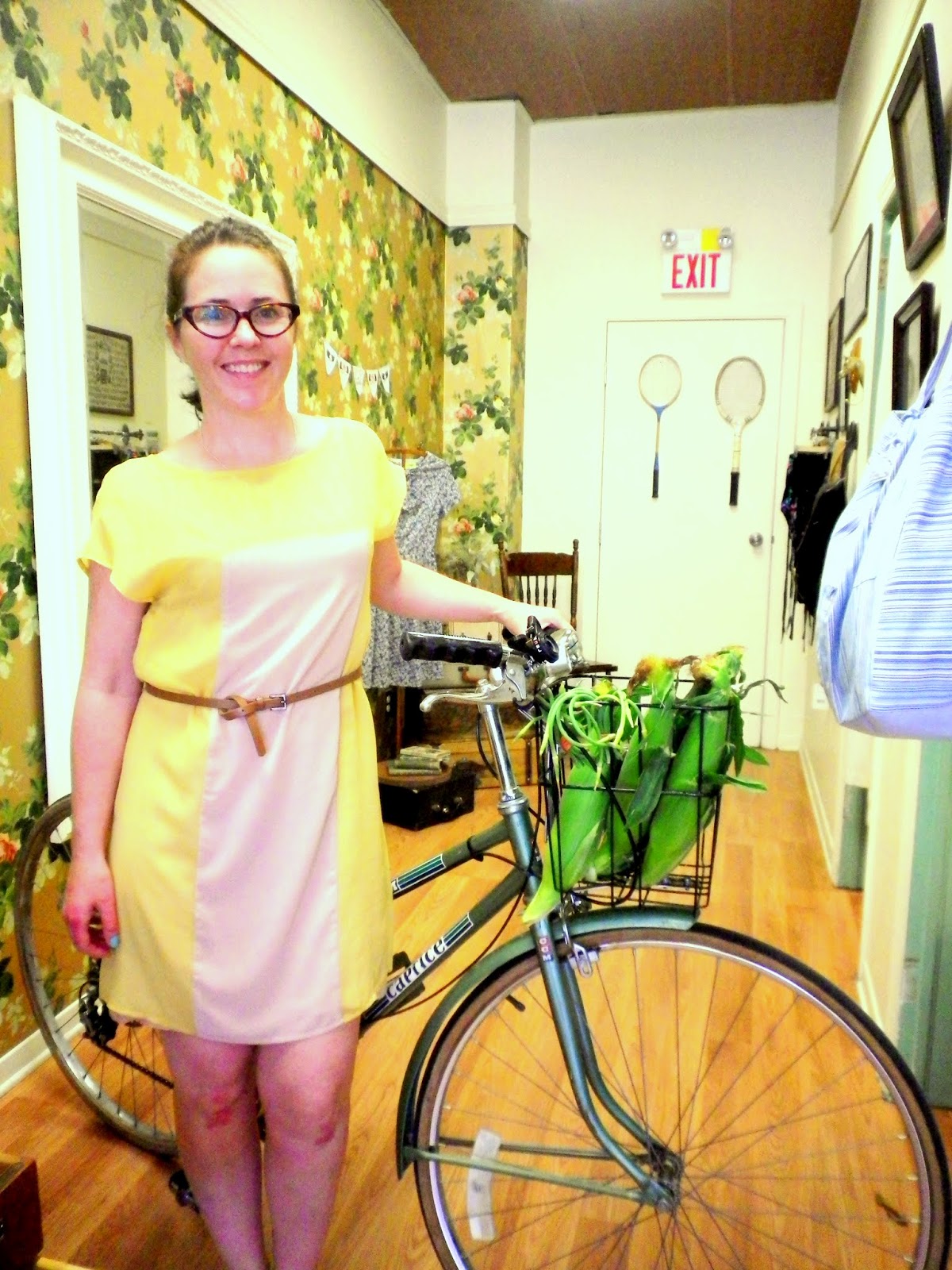 I rode my bike to work today and rediscovered a local treasure. The Parkdale Market is open 7 days a week and sells beautiful local produce at very reasonable prices. I had a half hour to kill so I browsed and picked up some sweet corn and garlic scapes. Mmm, going to chop up the scapes in some butter to melt over the roasted corn. This is also a really sweet recipe for Garlic Scape Pesto. Back to the original idea for this post, I rode my bike to work today in a dress. It is too freaking hot to wear anything else! Mabel (my sweet ride) and I cruised the Ottawa River Parkway and felt cool as a cucumber. On a hot day like this, I encourage you to hop on your bike wearing a pretty dress and go explore a new neighbourhood, buy fresh veggies or picnic by the river.