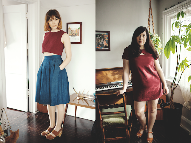 Left: Triller Top in Burgundy, Songlark Skirt in Dark Wash Denim. Right: Weaver Dress in Burgundy. Triller top also available in Black, Songlark Skirt available in 4 different colours, find them here. Weaver Dress also available in Black. There are so many fun combinations you can make mixing and matching her prints and solids!