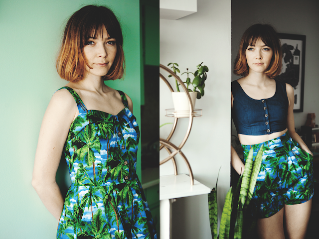 | Left: Sylph Dress in Palm Trees. Right: Tapaculo Top in Dark Wash Denim, Wren Shorts in Palm Trees. |