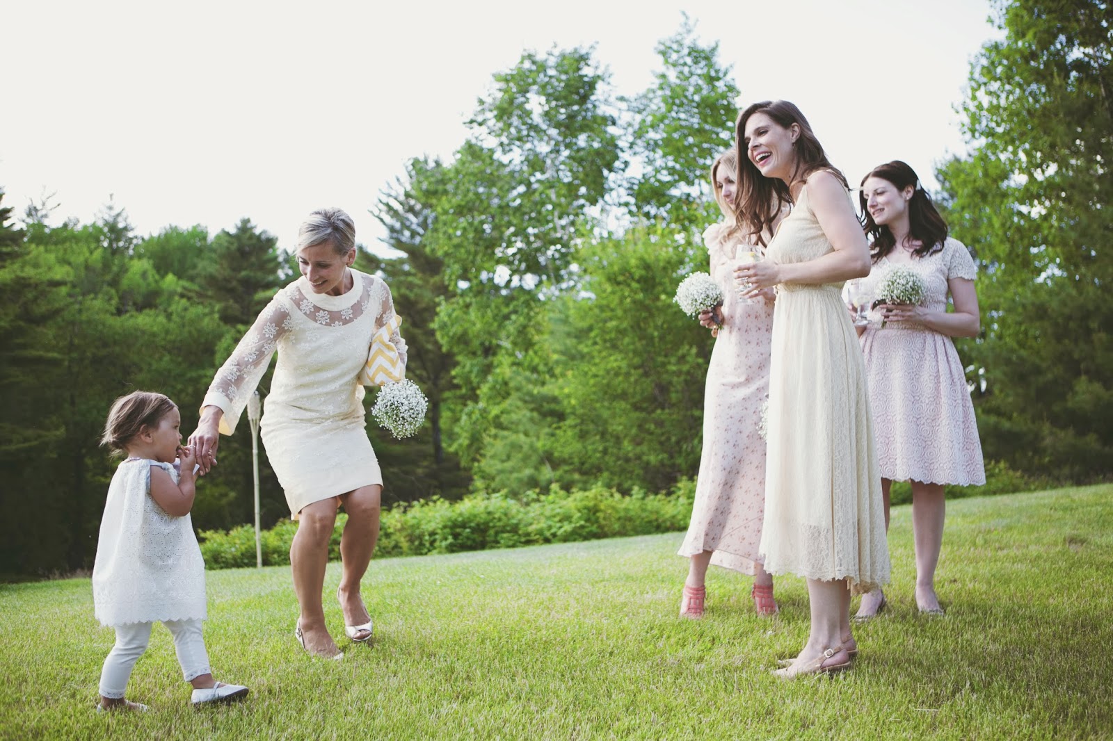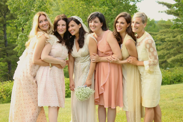 Renee Morra (co-owner of Viens avec Moi)'s  wedding party all wore dresses from our vintage sale at her beautiful wedding this Summer. I love when brides come into our sale shopping for bridesmaid dresses. Even though all the dresses are completely unique, it's still totally possible to have a unified look if all the dresses are in the same tones. What a great way to show your bridal party's personality!