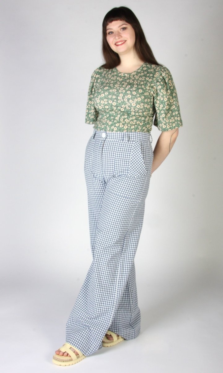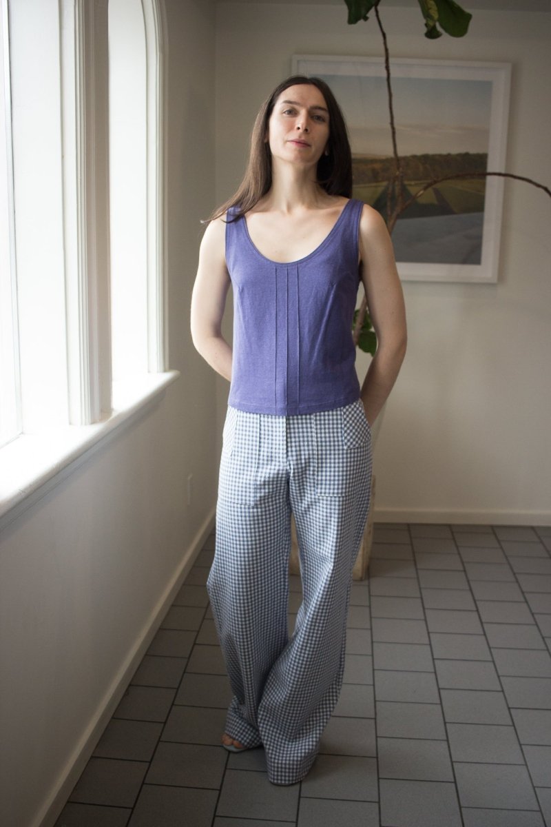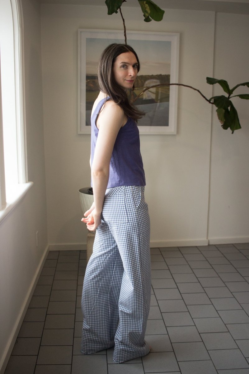 The Gannet Pants by Birds of North America are a wide leg pant made of medium-weight, organic cotton gingham. It closes with a fly front and button at the waist, and has playful directional pocket details on both the front and back!