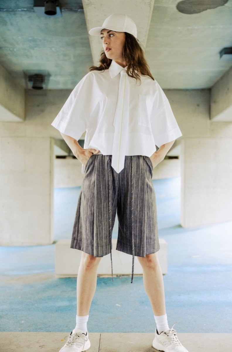 Bodybag by Jude's Montego Cropped Shirt is crisp cotton oxford style button up done in a boxy and oversized relaxed fit. Featuring a modest collar, short wide sleeves and single patch pocket on the front adorned with Bodybag's signature neon thread detailing. The Montego Cropped Shirt has a high-low hem where it is cropped in the front and hangs slightly longer in the back with a center back pleat that accentuates the volume the shirt.