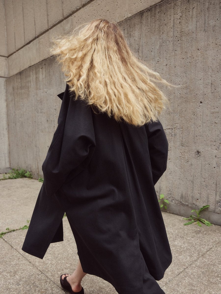A quietly bold jacket with Scandinavian sensibility. The Pope Jacket by Eve Gravel is designed in a relaxed, cocooned silhouette, it features a high stand loosely structured collar, subtle contrast piping, and a clean button-front that keeps the look pared back and intentional. The oversized shape drapes with ease, offering roomy side pockets and soft loosely structured sleeves for just the right amount of volume. It's unfussy and modern, giving it that unmistakable Copenhagen cool girl vibe!