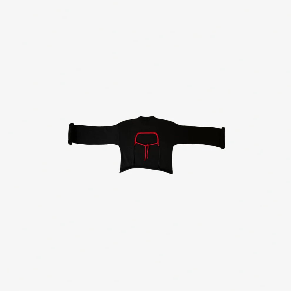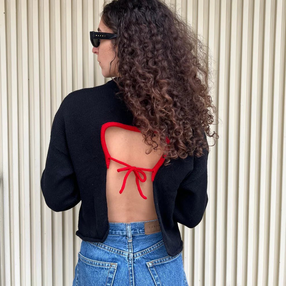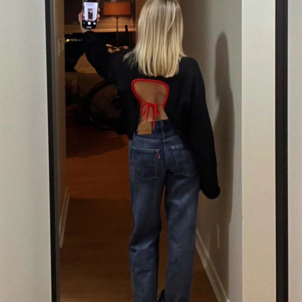 Business in the front, party in the back ;) The Bonny Sweater by Giveh is anything but your basic crewneck sweater! This open-back knit brings a playful twist to a cozy crewneck. The solid black contrasts delightfully with the bright red collar and tie strings--it's the kind of piece that turns heads, turning a casual moment in a quiet statement. Easily layer over a cami, cute bralette, or simply show off your back with the Bonny Crew!