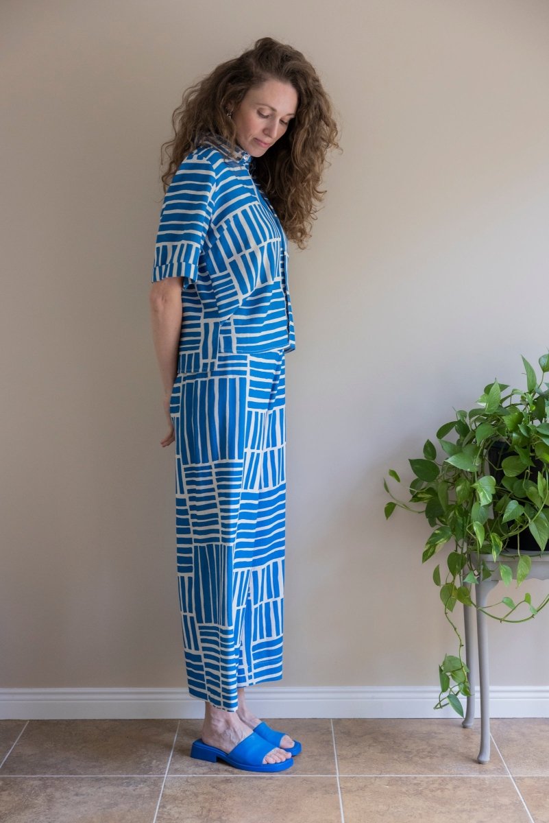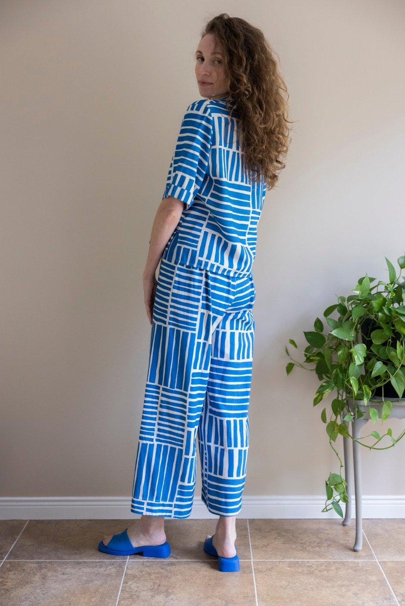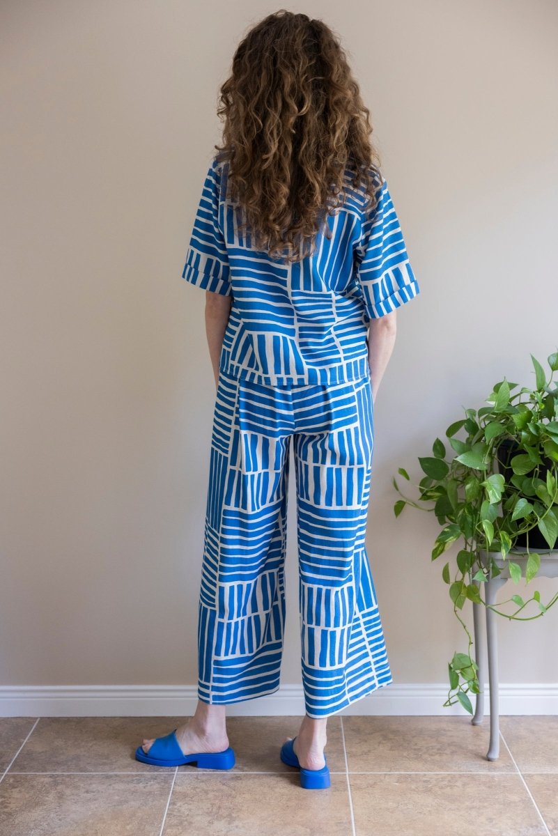Playful yet polished! The Norah Shirt by Marigold is an easy breezy short-sleeved button-up shirt featuring an bright blue block print design. The silhouette is easy and airy with a slight boxy shape, making it ideal for warm weather or laying over a tank top. Wear it open, tucked, or tied at the waist. Pair with the matching pants for a full off-duty summer uniform!