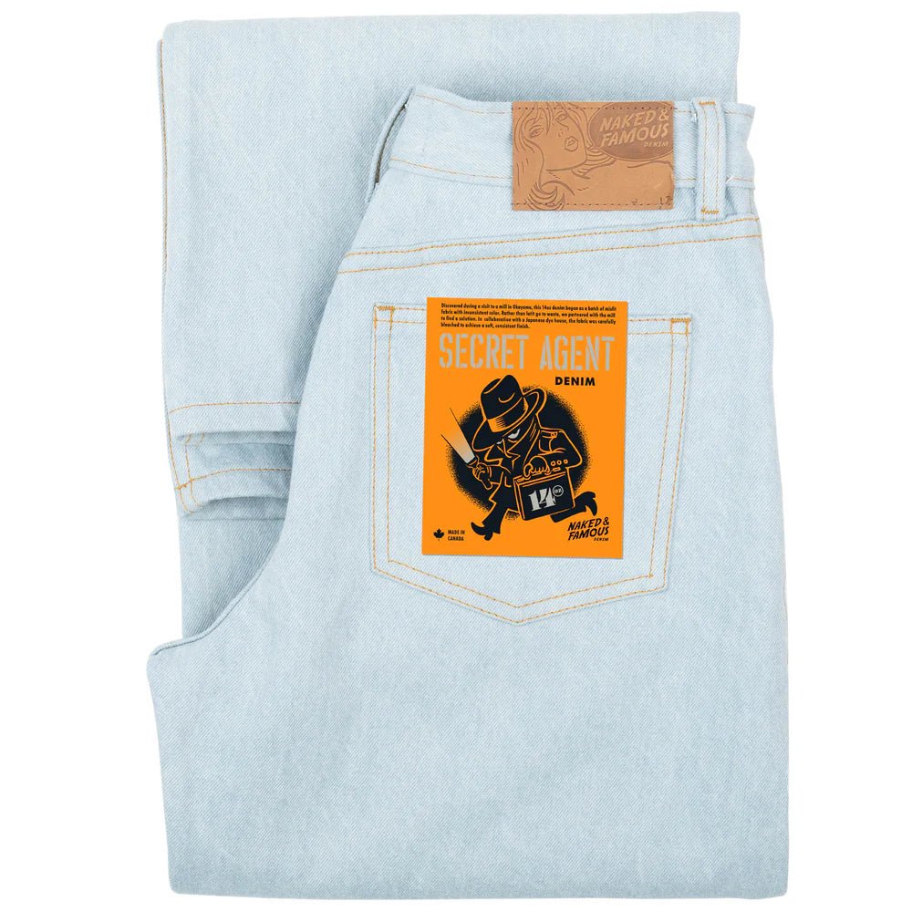 The Wide Wild West Jeans by Naked & Famous are a classic 5-pocket jean that brings laid-back attitude to a timeless silhouette. The fit is relaxed with a mid rise, featuring a wide, full-length leg. Despite the bleaching process, this denim retains substantial body and durability at 14oz, while offering improved drape and comfort from the start. Finished with a full-grain leather patch, Secret Agent Denim reflects a creative rescue that turns imperfection into character!