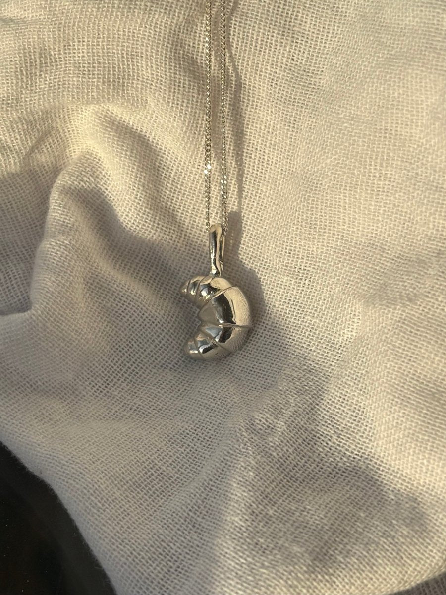 A freshly baked, scrumptious looking croissant hanging from a silver chain.