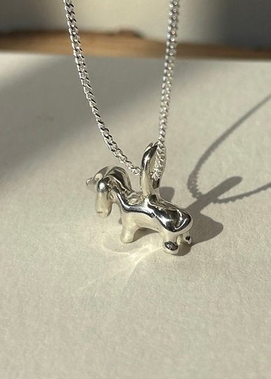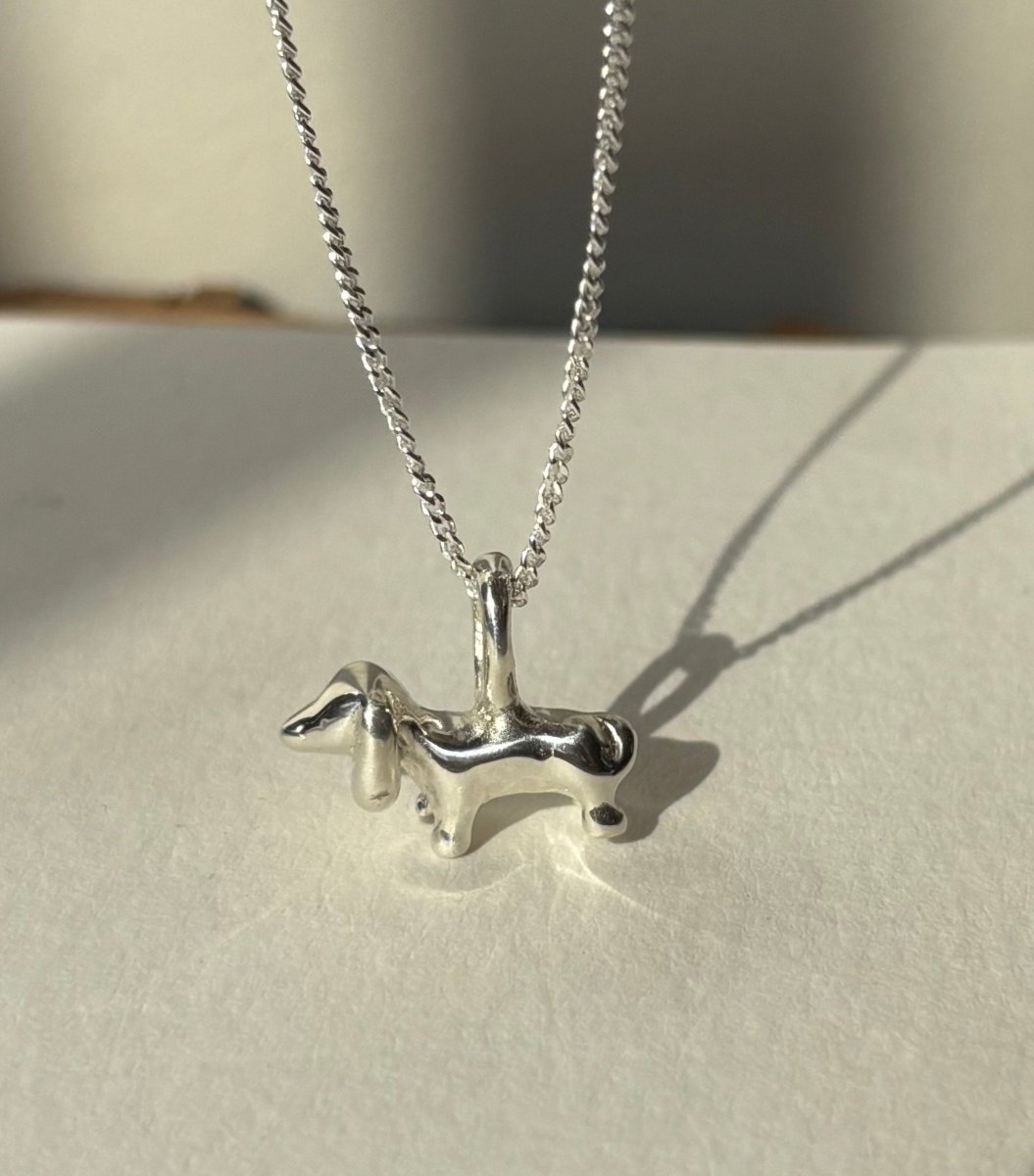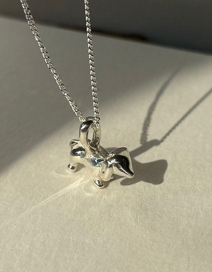 The sweetest little puppy charm, handmade in sterling silver and hanging from a silver chain.