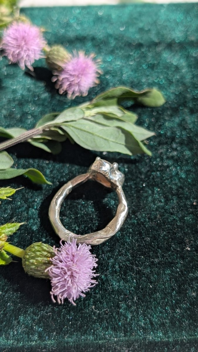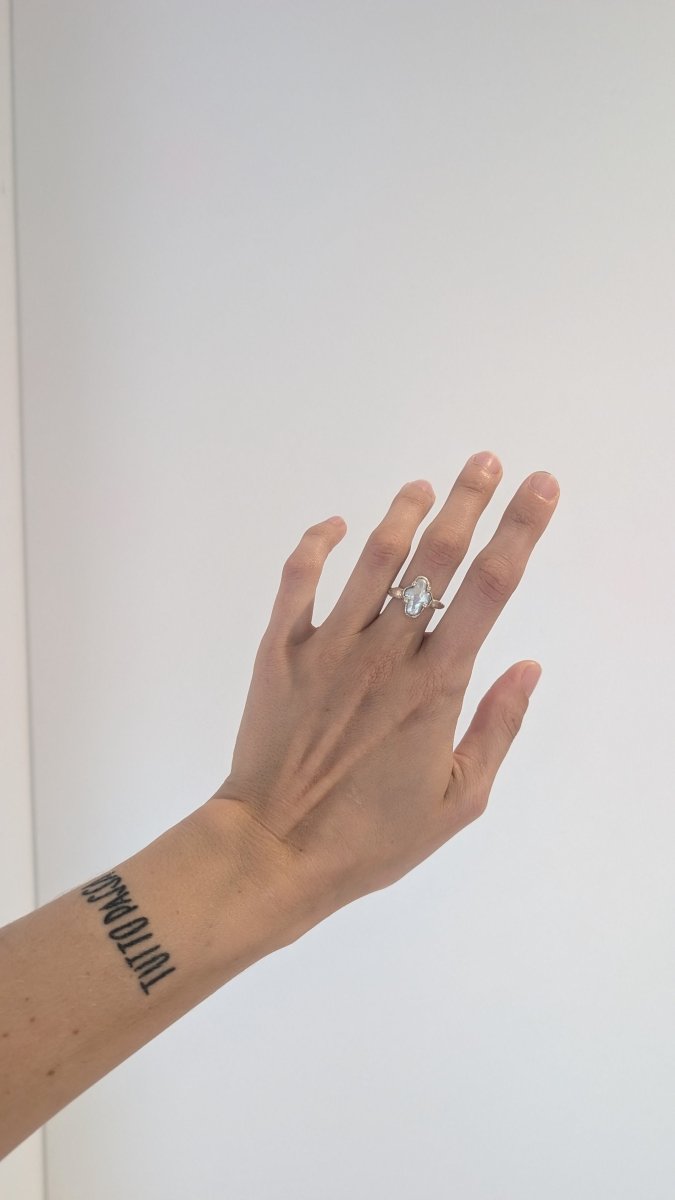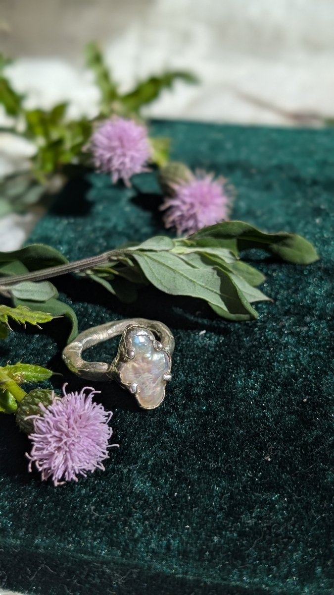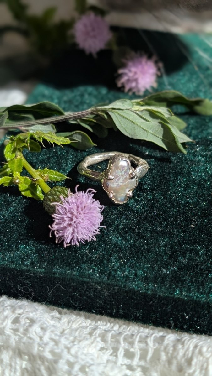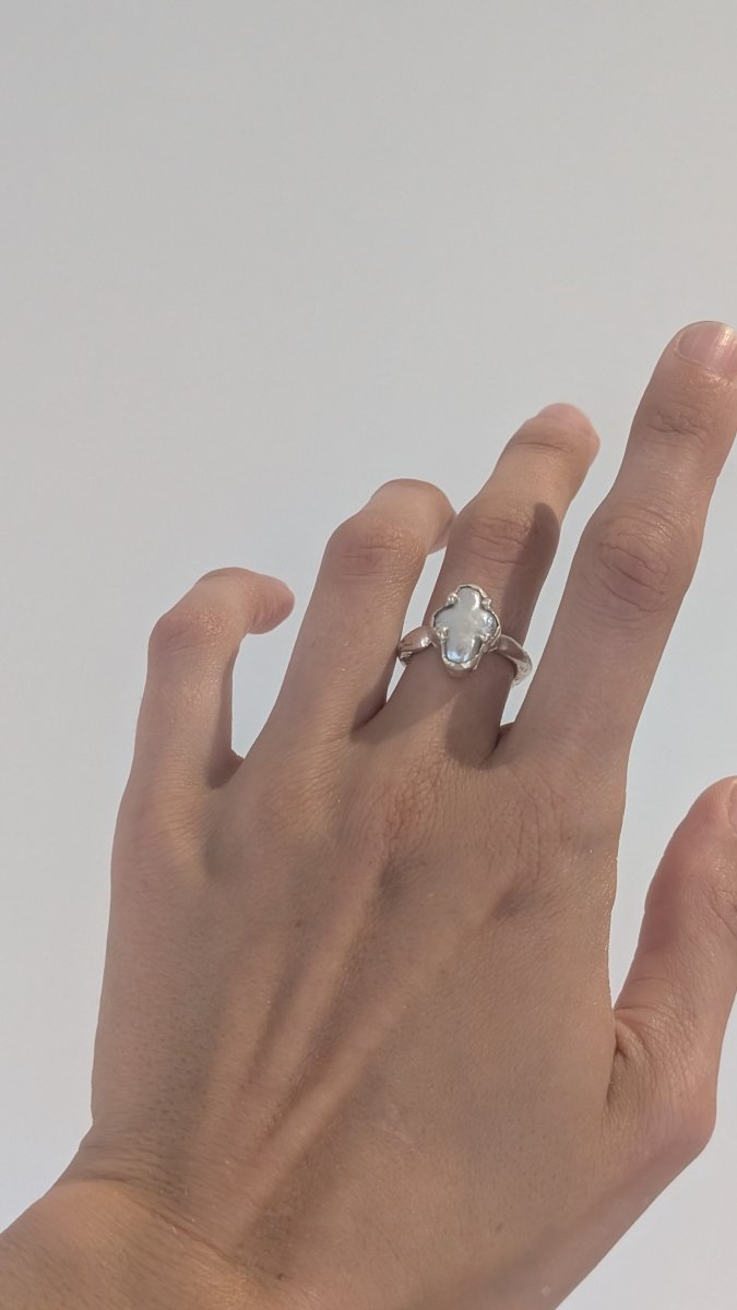 A precious sterling ring featuring a clover shaped freshwater pearl in the center by Atelier Melrai!