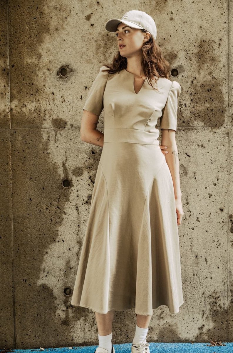 Bodybag's Ronnie Dress is a structured top crafted from a Tencel cotton blend, the fabric is soft yet substantial, with fluid bias-cut lines that enhance movement. The silhouette features structured short sleeves and a crossed gallon insert at the mid-back to emphasize symmetry and a metallic back zipper with a long silver leather pull provides a seamless closure.