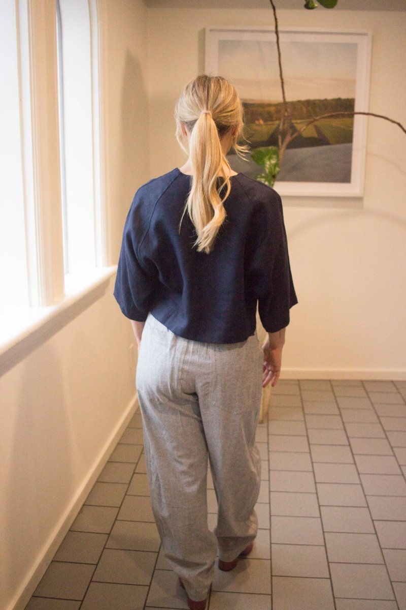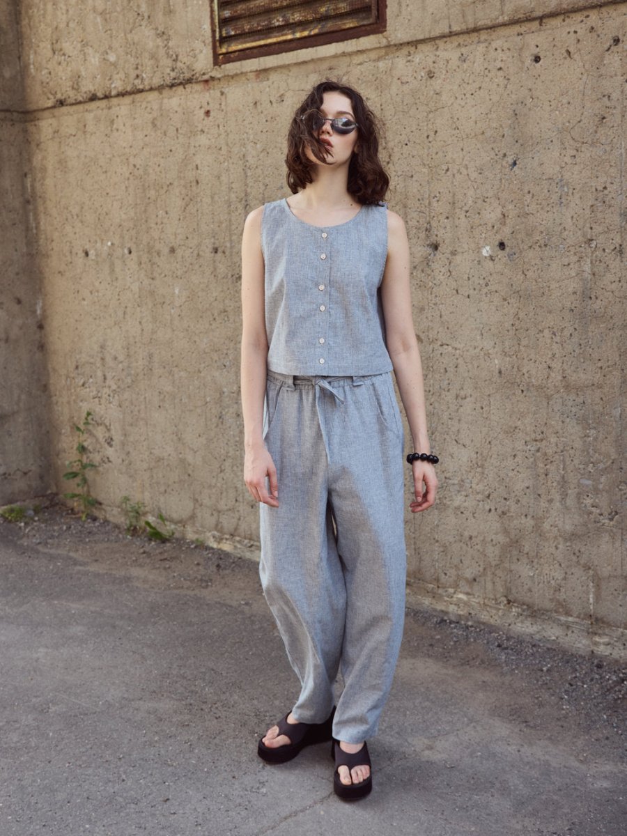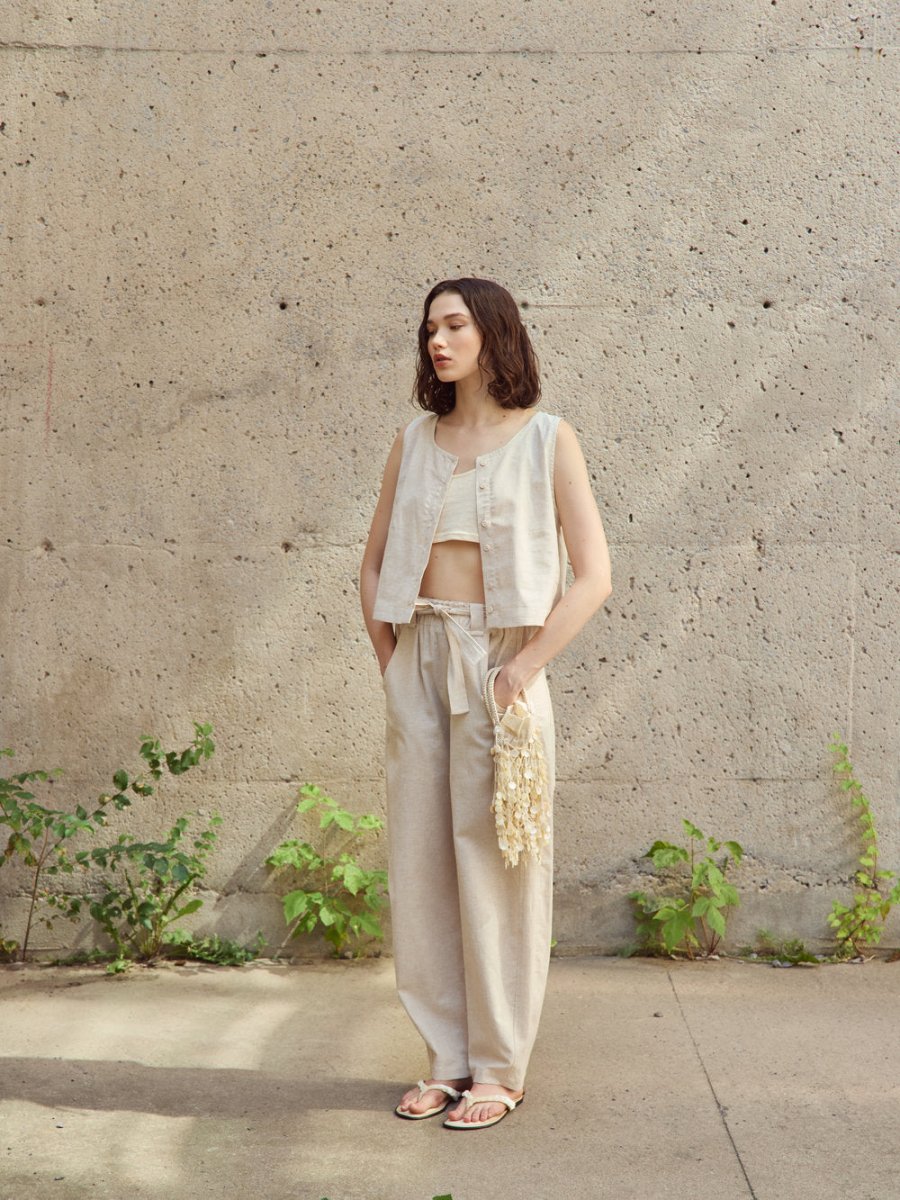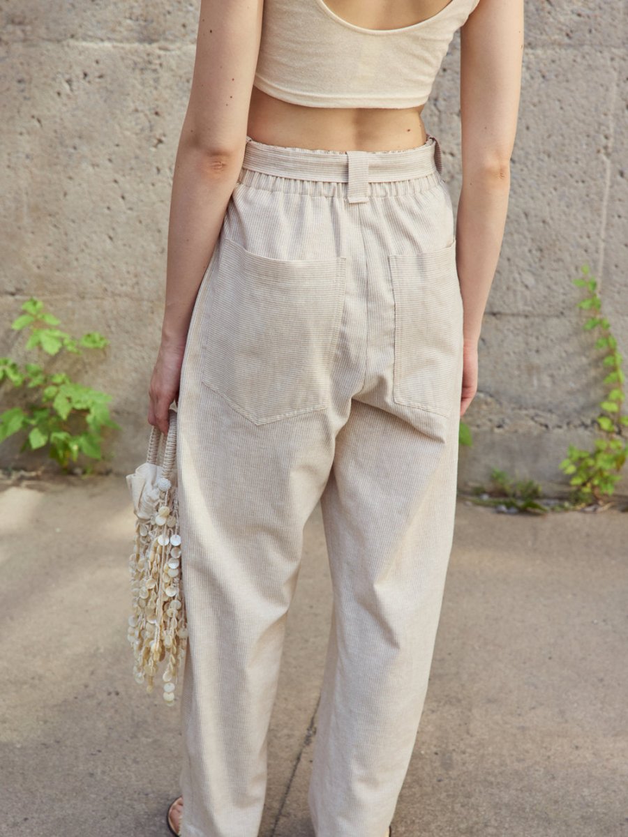 The Edward Pants by Eve Gravel are an arc-cut striped trouser, designed in a light linen and cotton blend fabric for a cool feeling throughout the day. The vertical side panels cut against the stripe direction add a unique graphic touch. Its wide straps and belt matching the waist bring a refined touch while guaranteeing a perfect fit. A chic and comfortable essential for all your outings.