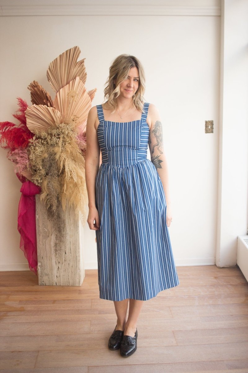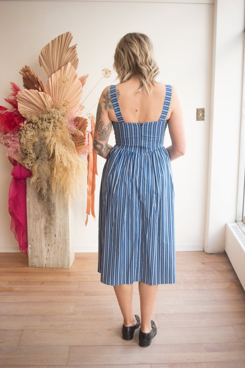Birds of North America's Heathwren Dress is a whimsical summer sundress, with pockets and a sweetheart neckline, made of beautiful royal blue striped cotton. The yoked waist drops to a point at front and back, where it joins a gathered skirt.