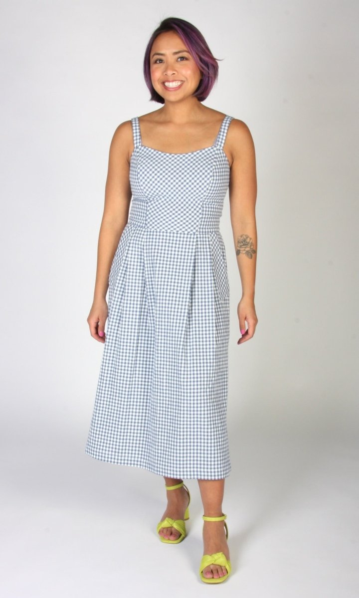 The Sparrow Hawk by Birds of North America is a tailored dress that's made of medium-weight, organic cotton gingham. It has playful directional gingham details on the top, as well as the front pockets. The neckline is faced, and it closes with a back invisible zipper.