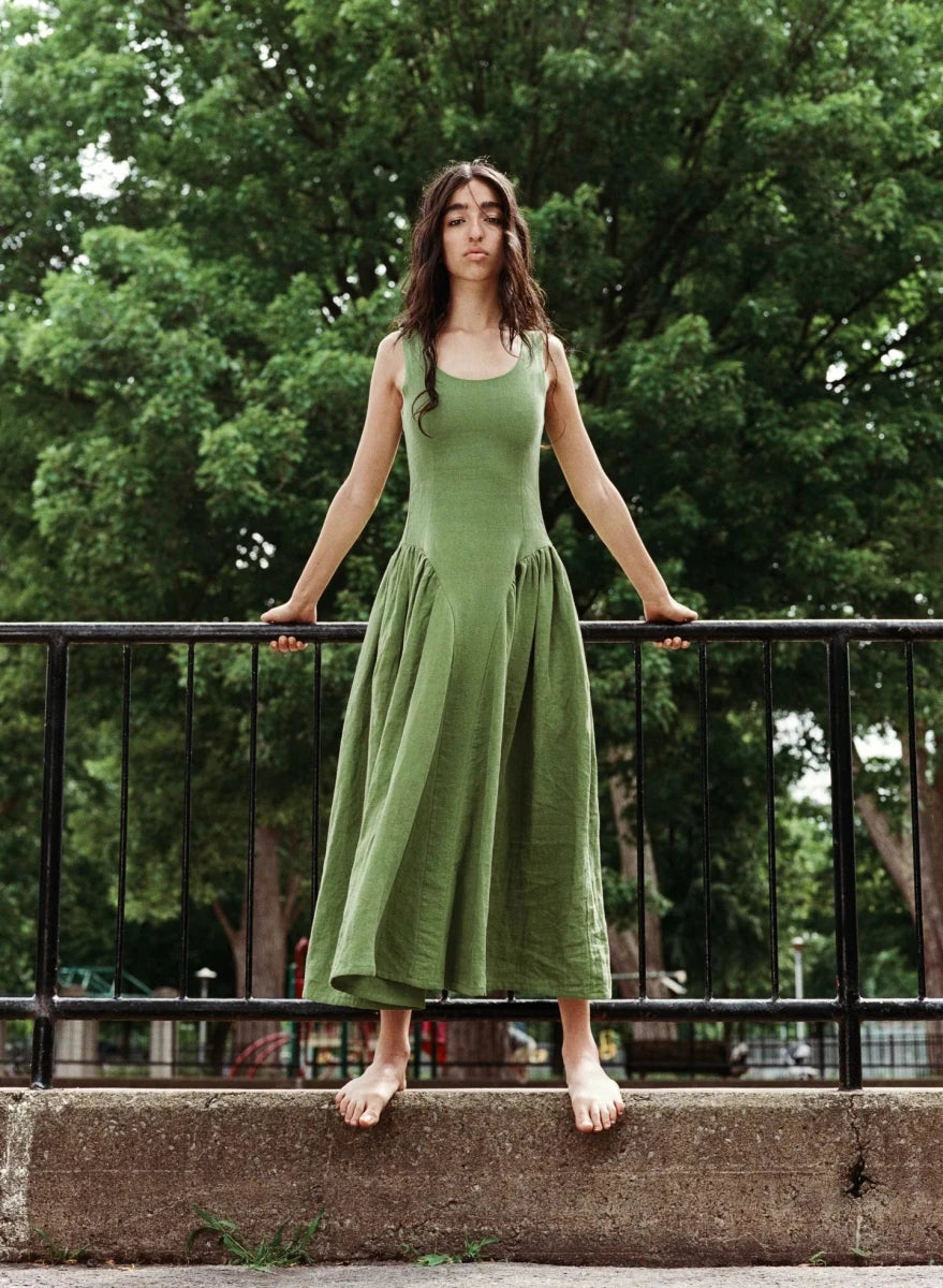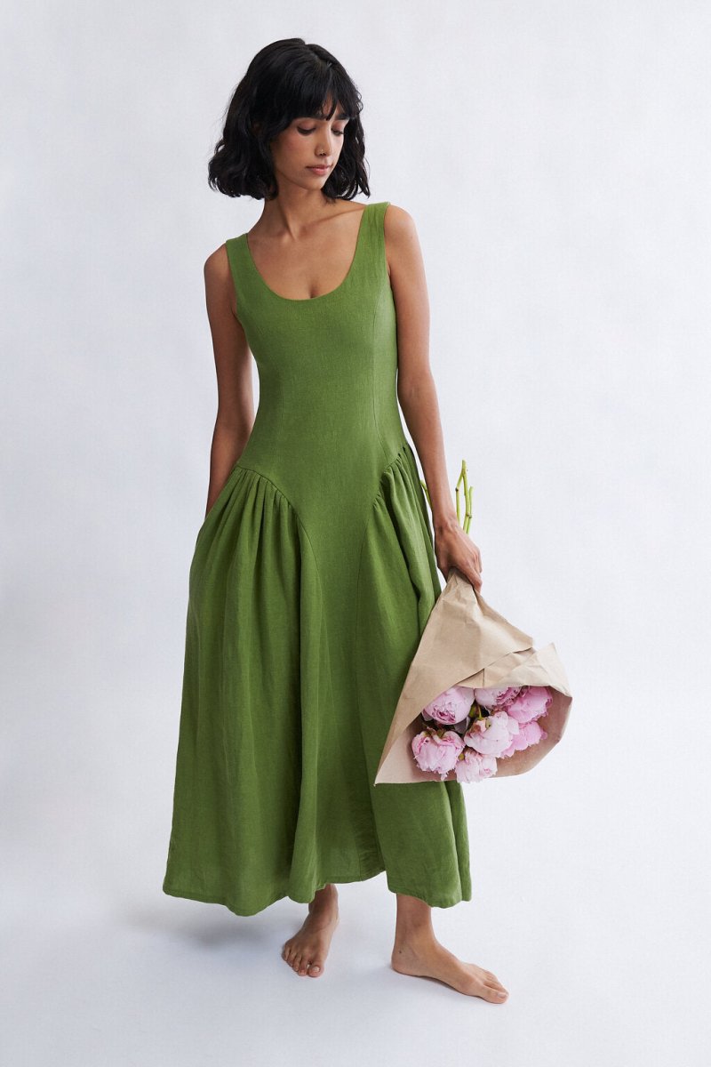 The Vivienne Dress Eliza Faulkner is a long linen dress featuring pockets, a scoop neckline, and a soft basque waistline. It closes in the back via a hidden zipper and is made from a 100% linen that feels soft and luxe with pleats extending from the waistline to the hem creating gentle movement and dimensionality. The Vivienne has a romantic feel, making it perfect to wear to a summer wedding or event!
