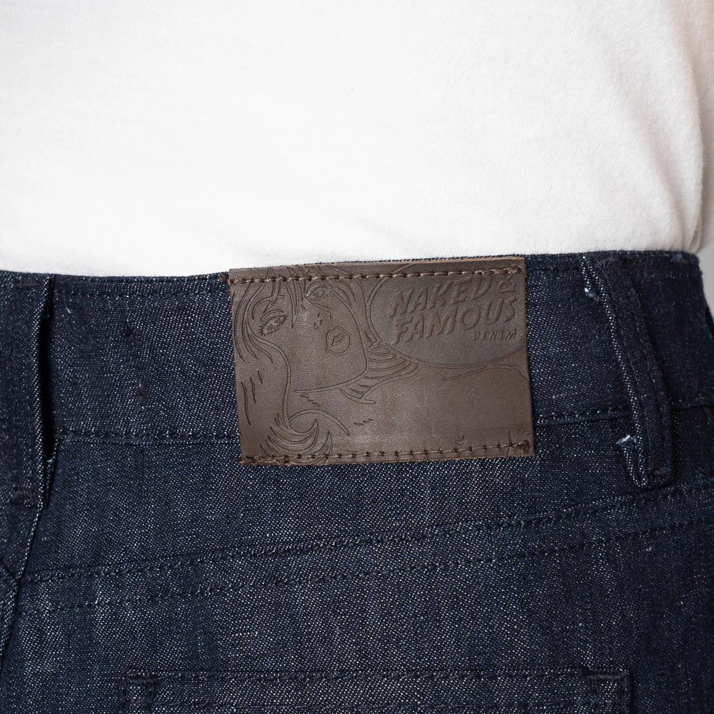 The Andie Short is the new Bermuda short by Naked & Famous! The Andie falls just above the knee and has a wide leg opening.  Featuring angled slash pockets in the front add a tailored touch, while the back keeps it classic with a traditional yoke and back pockets. Constructed from a 8.7 oz Japanese linen blend denim that is finished in a dark indigo tone with contrasting navy thread and tin hardware. The fabric is woven to combine the dimensional stability of cotton with the breathability, moisture management, and durability of linen.
