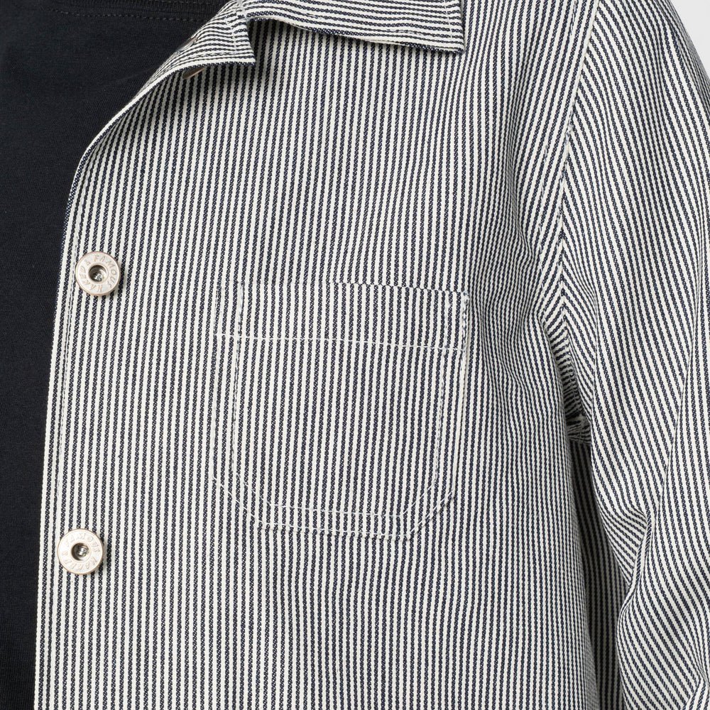 The Organic Hickory is a Japanese fabric woven from 100% cotton at 10oz, featuring classic vertical indigo hickory stripes inspired by vintage railroad and utility garments. The fabric has a firm, structured feel that breaks in gradually with wear, maintaining its strong graphic character over time.