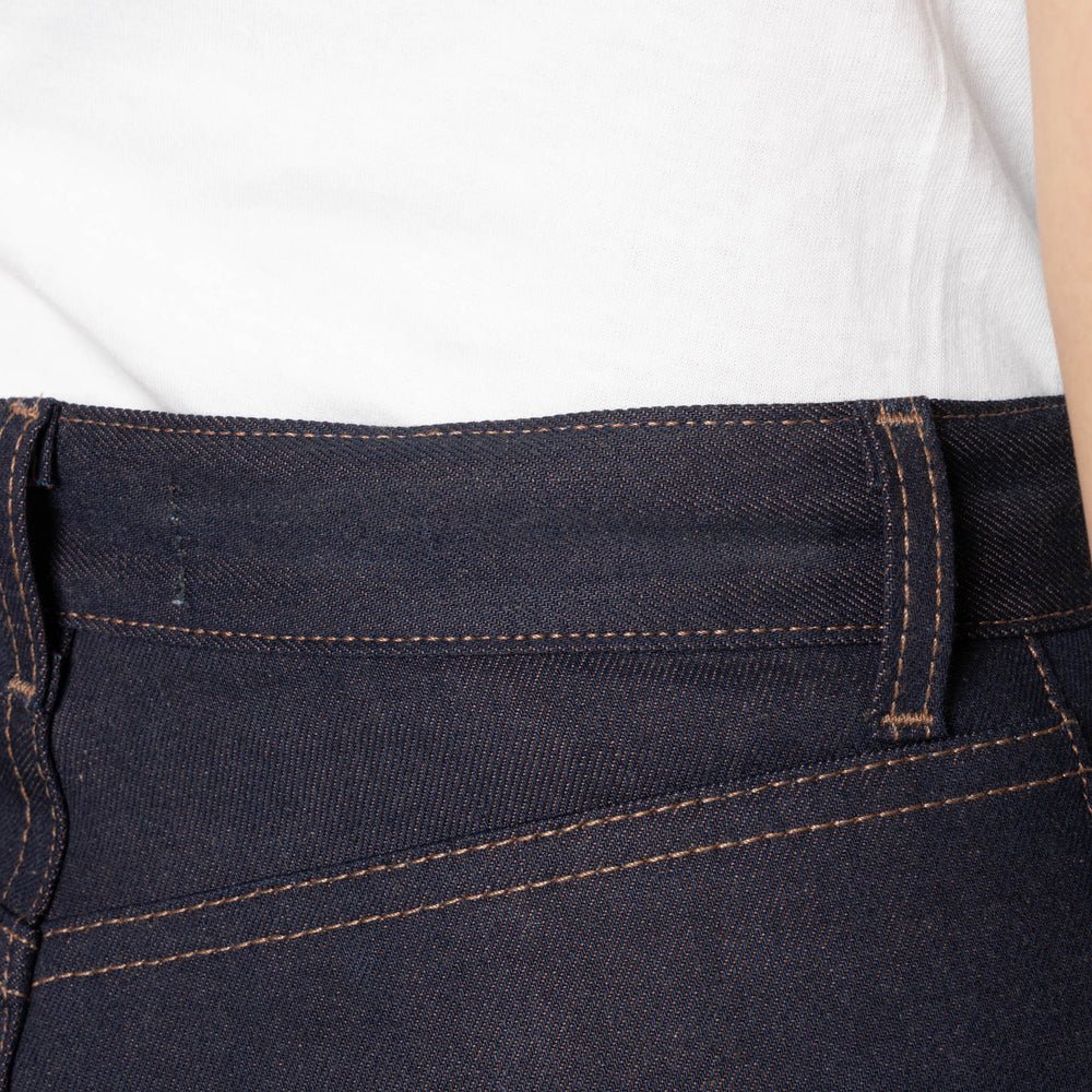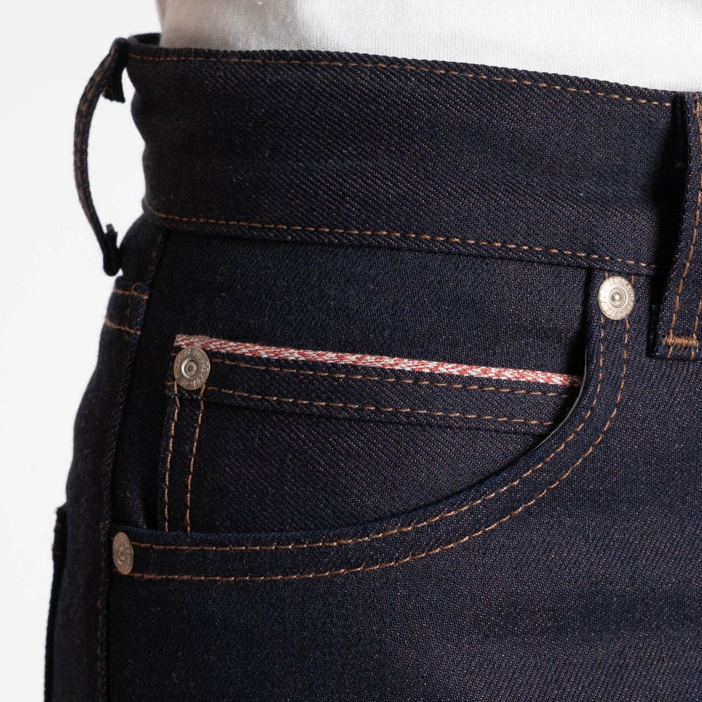 The Stretch Selvedge is one of the most popular core selvedge fabrics in Naked & Famous Denim's lineup. Woven on vintage shuttle looms in a right hand twill construction, this 12.5oz Japanese selvedge denim combines the comfort of stretch denim with the beauty and fading potential of raw denim. The 2% elastane eliminates the break-in period and gives you a continual level of comfort that you can't experience in 100% cotton jeans. Other details include contrast stitching, full grain English tan leather patch, red selvedge ID, silver metallic buttons and rivets. Super Girl is an everyday denim essential.