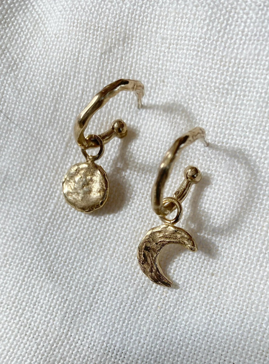 A mismatched pair of earrings by Hawkly featuring two phases of the moon. One earring shows a crescent moon, the other a full moon- each dangling from a hand formed hoop.  Available in sterling silver or cast bronze.