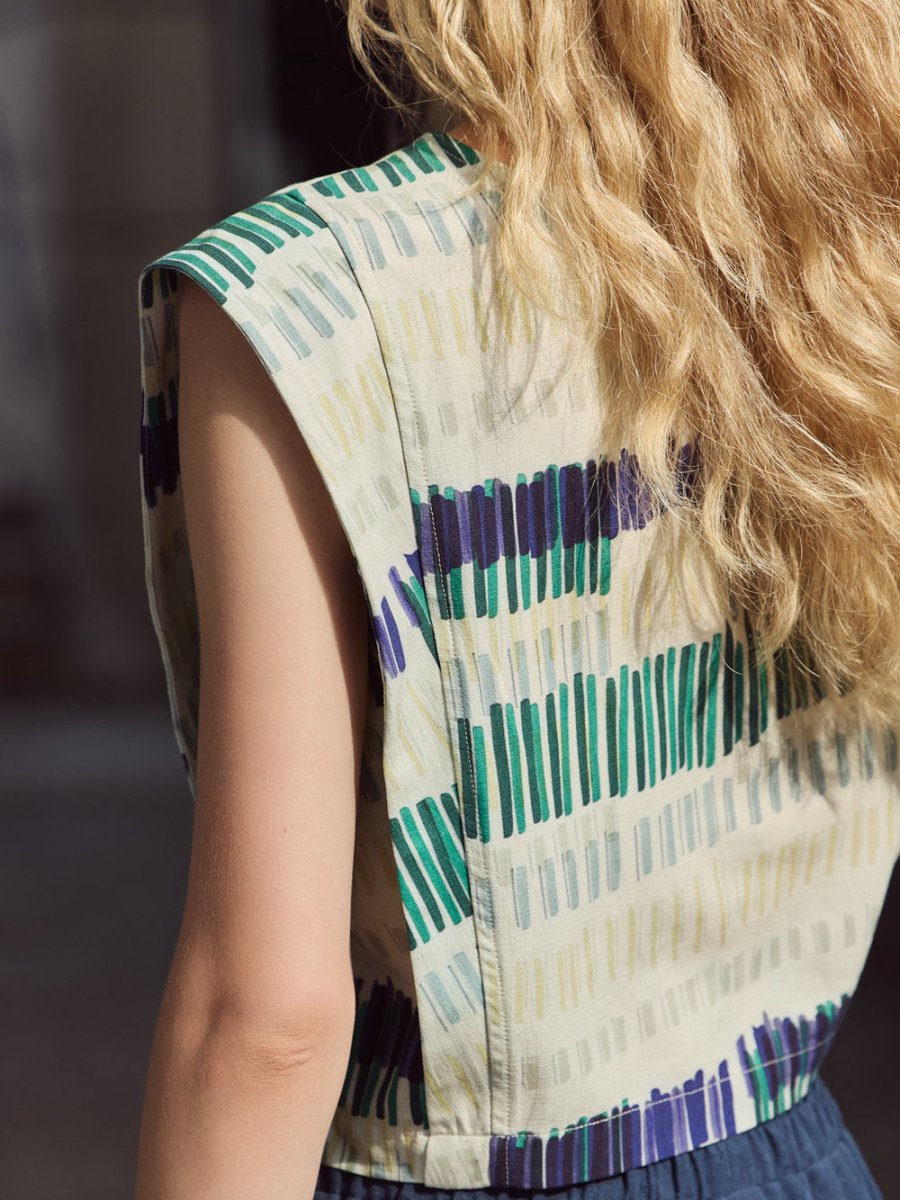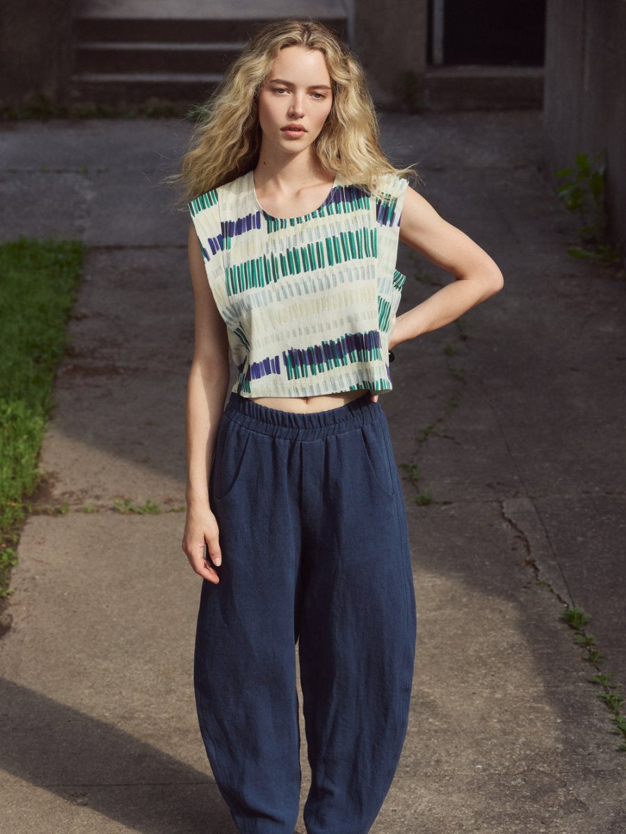 An easy sleeveless top with clever details! The Lucas Top by Eve Gravel is a cropped, sleeveless piece with a relaxed boxy silhouette that sits jut as the waist. This top features subtle cinching at the arm opening for a comfort and ease of wear. Clean panel lines create gentle structure through the body, providing movement without feeling stiff. It's lightweight and breathable, the kind of piece that looks effortless but feels thoughtfully made. The prints are designed in Eve Gravel's Montreal studio making this piece even more special!