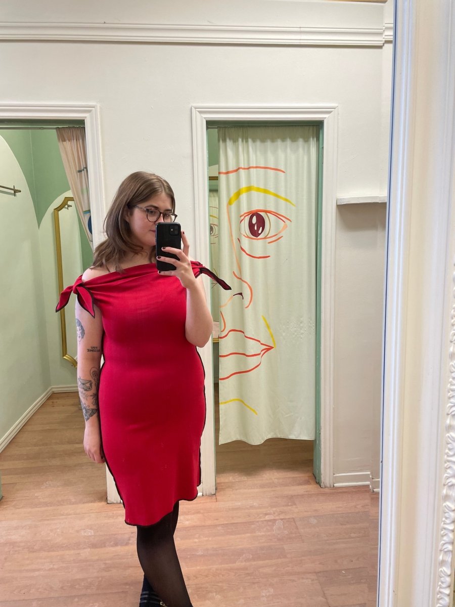 Meet the Lavonne Dress by Eliza Faulkner! The Lavonne is inspired by the Pepper Top in the same collection, it's an off the shoulder dress featuring two adjustable bow ties (that are also removable)! on the sleeves and is made from a soft, stretchy ponte fabric that feels like a hug, this piece is both ultra comfy and ultra flattering! We love the exposed contrasting stitching and body hugging silhouette! Pair with a kitten heel and small bag for a night out or fancy event!