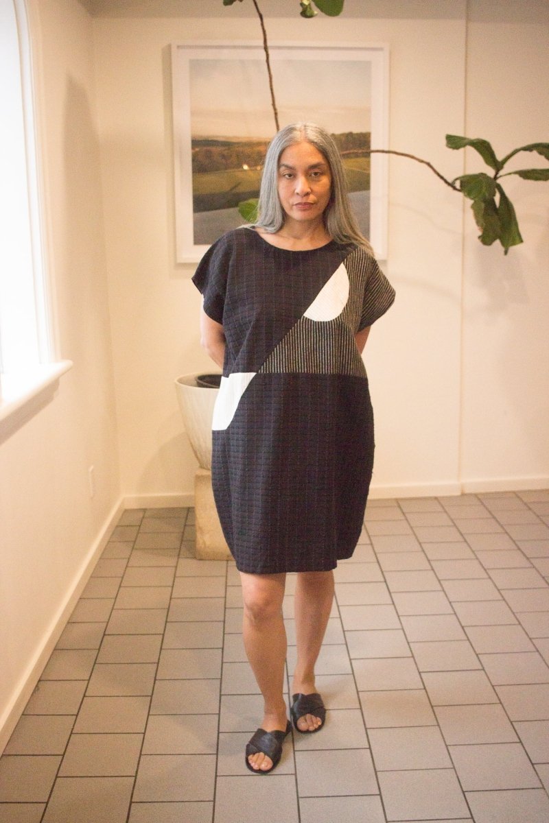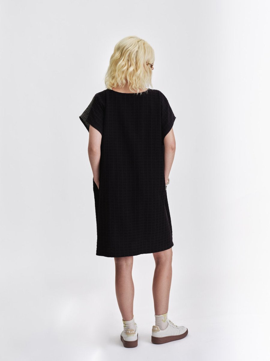 The Ambrosia Dress by Jennifer Glasgow is an effortless tunic style dress crafted from a soft cotton blend, windowpane jacquard with a bold colour-block design, a staple from this designer! Falling just below the knee, it features a relaxed silhouette and a hidden on-seam pocket for everyday ease!