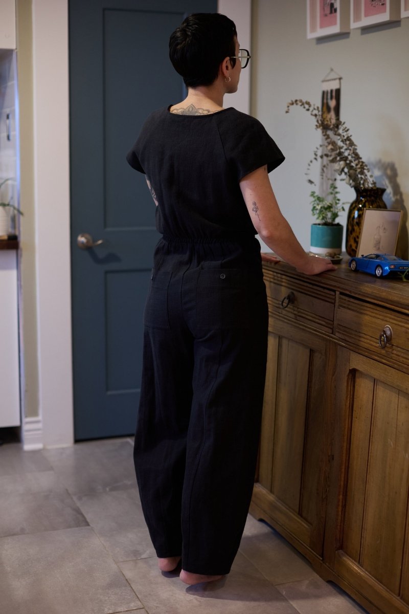 A bold balance of utilitarian edge and feminine power, The Cybele Jumpsuit by Jennifer Glasgow is your go-to for vibrant, everyday style. It features front and back patch pockets, a sleek brass zipper, and a relaxed one-piece silhouette with an elasticated waistband for extra comfort and ease of wear. The bodice showcases integrated cap sleeves, and a striking geometric style line across the chest, while the balloon-shaped legs bring a playful, fashion-forward finish.