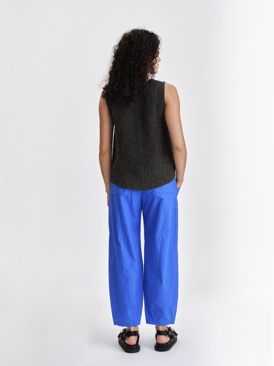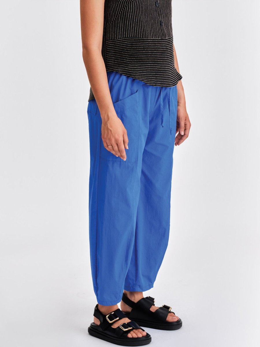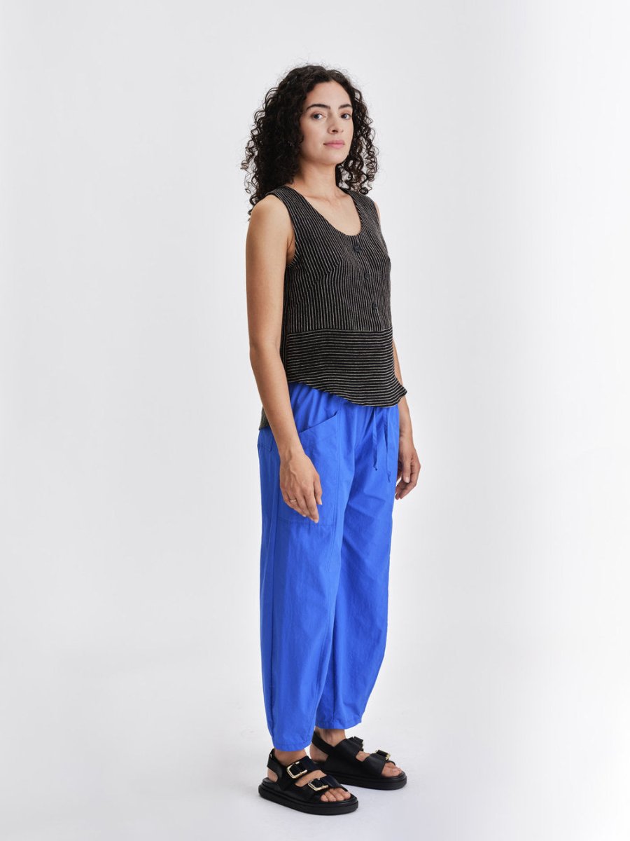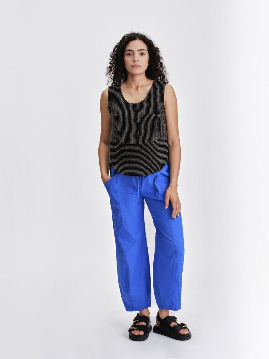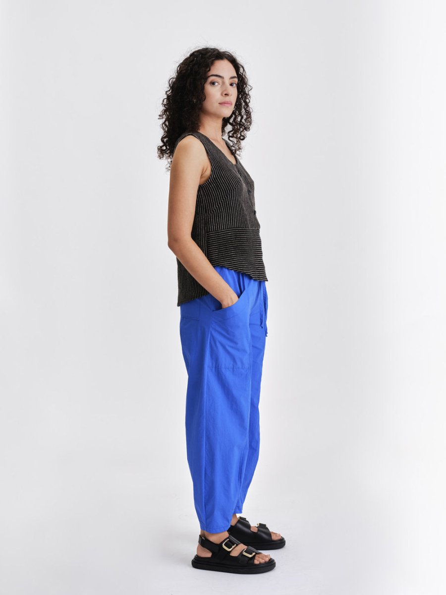 Jennifer Glasgow's Electra Pant are a modern track pant style with a high waist pant. They feature an elasticized waistband and drawstring for an ultra comfy fit! Made in a crisp 100% Oeko-Tex certified cotton, they have funnel shaped legs, front and back pockets with subtle style lines. Slightly cropped, they look as great as they feel.
