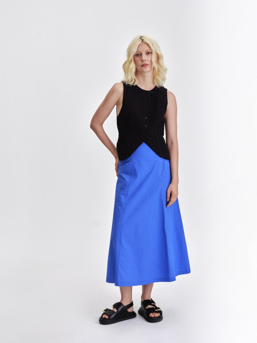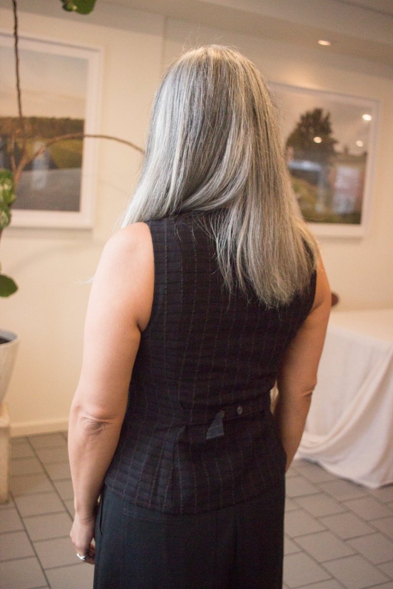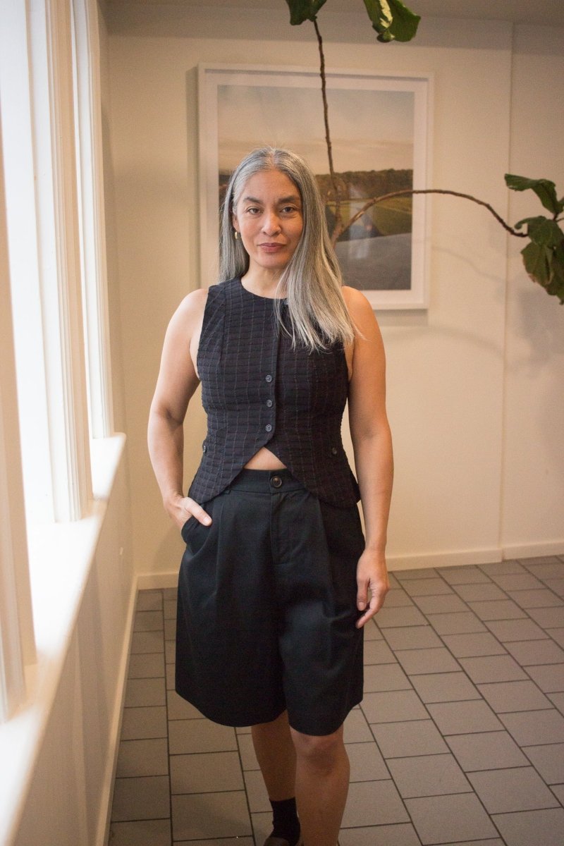 The Vela Vest by Jennifer Glasgow is a tailored essential with quiet confidence. Its fitted silhouette is shaped by elegant princess seams, while small lapels and discreet pockets add just the right amount of detail. Designed to be worn open or closed, it's a versatile layer that adds effortless style to any outfit! The back as two tabs with buttons to adjust to your liking and its made of a soft cotton blend in a windowpane motif jacquard and lined with a light cotton poplin.