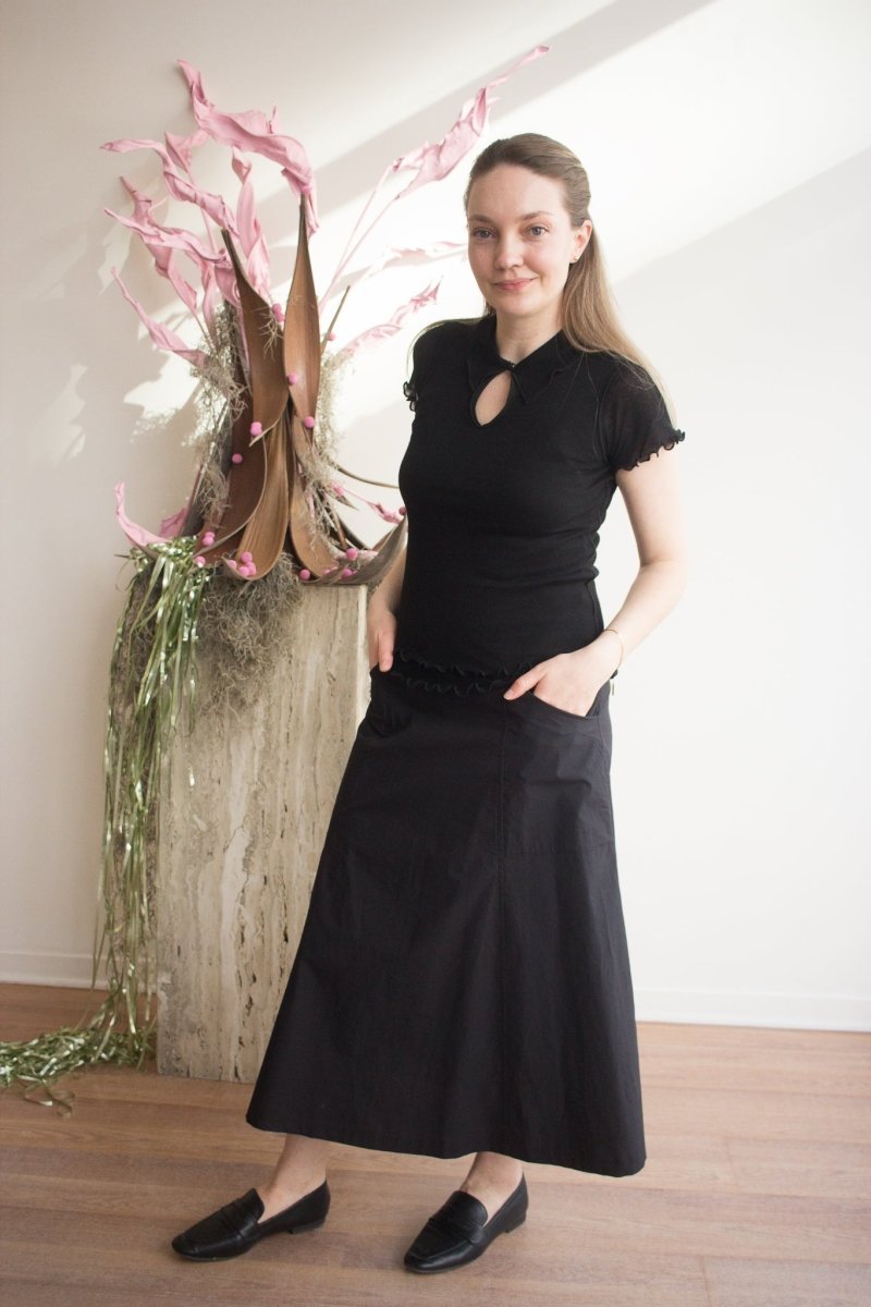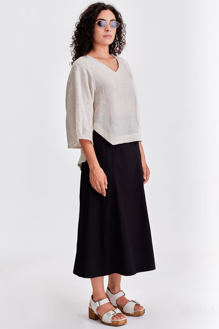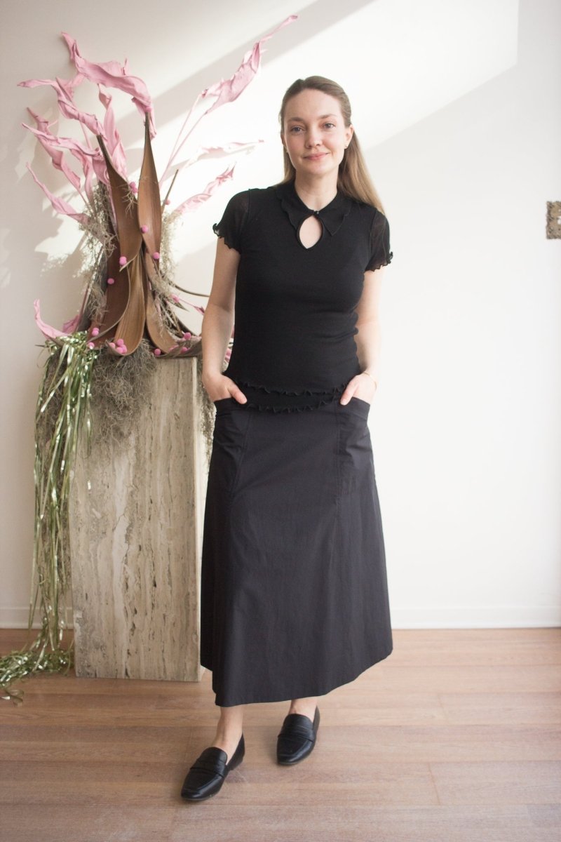 Jennifer Glasgow's Volans skirt is a true classic with a modern edge. This midi length skirt is made in a versatile cotton twill, and features a subtle flare at the bottom. The Volans skirt sports front pockets for practical day-to-day wear and an invisible zipper at the back.