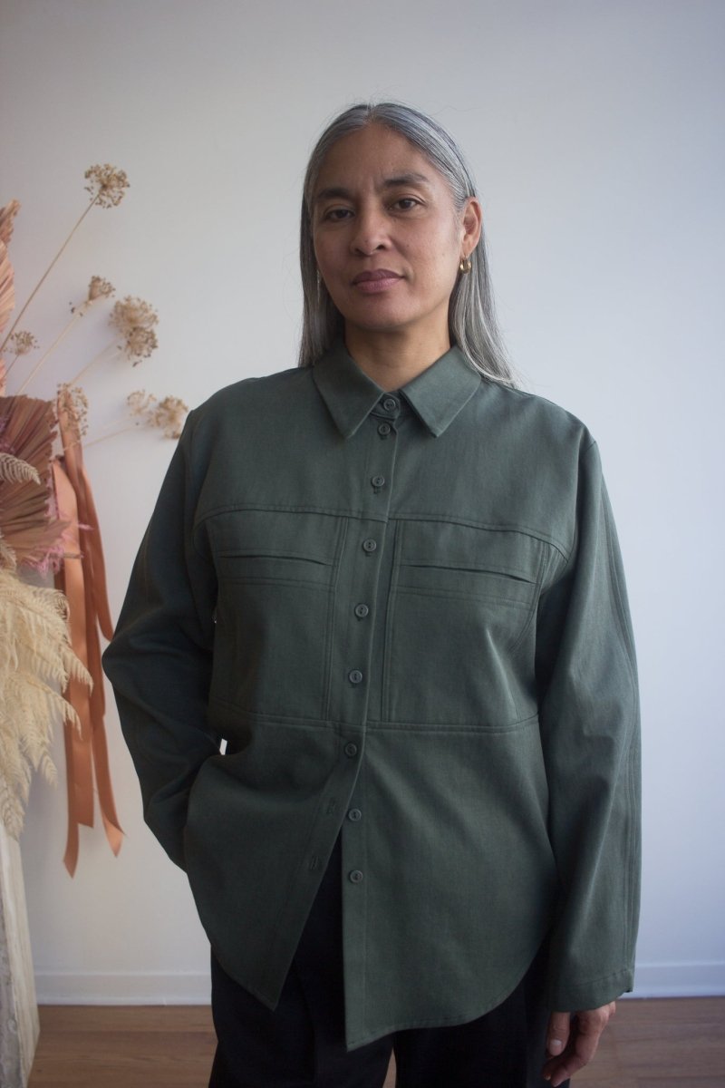 Eve GraEve Gravel's Pompei Overshirt is a workwear lover's dream! This structured button down features a slightly oversized fit and two slit pockets at the chest. This piece works great as a light jacket or on it's own as a heavyweight collared shirt.