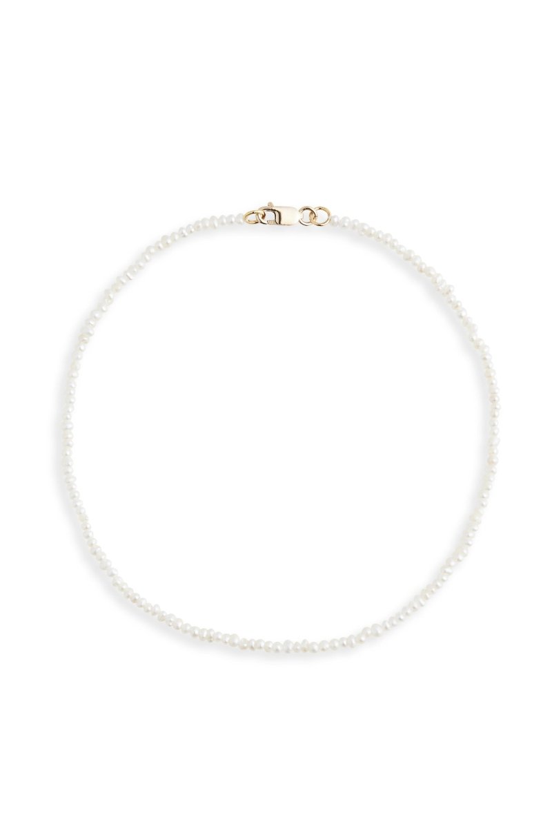 The Sparrow anklet from Lisbeth features a hand-strung strand of tiny, organic, round pearls fastened by a 14K gold-fill lobster clasp. A beautiful, minimalist staple.