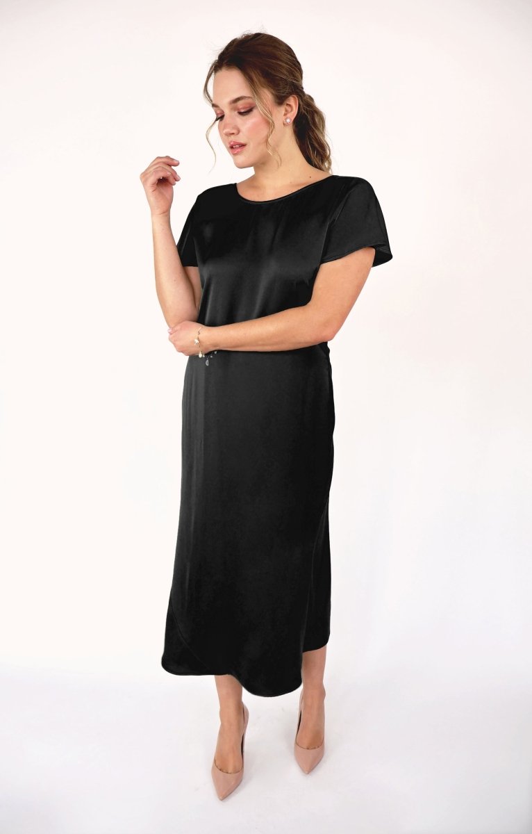The Aurora Dress by Korelli is a reversible maxi dress-- a two for one dress! One side features a subtle bateau neckline, and the other, a more pronounced neckline for a bolder style. The draped short sleeves provide comfort and lightness. The "Goethe" side features a slightly flared cut, creating a fluid and feminine silhouette. Crafted from a smooth, lightweight, and wrinkle-resistant polyester satin fabric with a beautiful sheen, this versatile dress is ideal for a variety of occasions, combining elegance and practicality in one ingenious design.