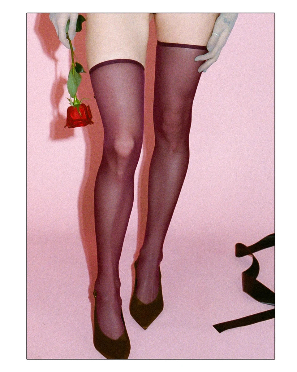 The Blaze Stockings are made with a high quality stretch mesh. They are cut above mid thigh and are held in place with ties at the back.