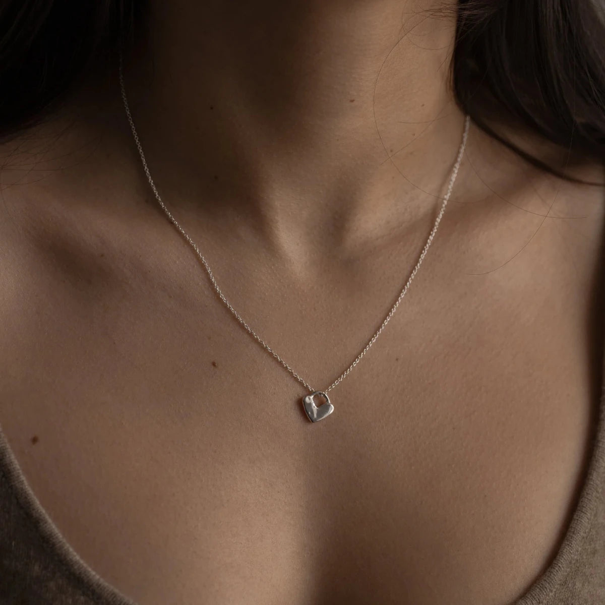 A hand formed heart pendant with an organic texture and soft edges hanging from a sterling silver chain by S.J. Crawford.