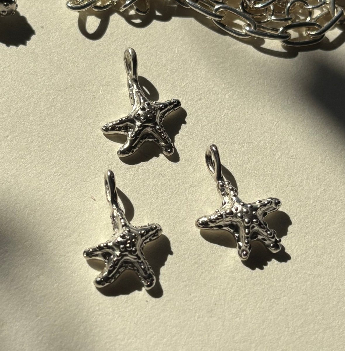 A hand-carved sterling silver starfish hanging from a thin silver chain. Please note that the chain is included, despite not being shown in the photos!