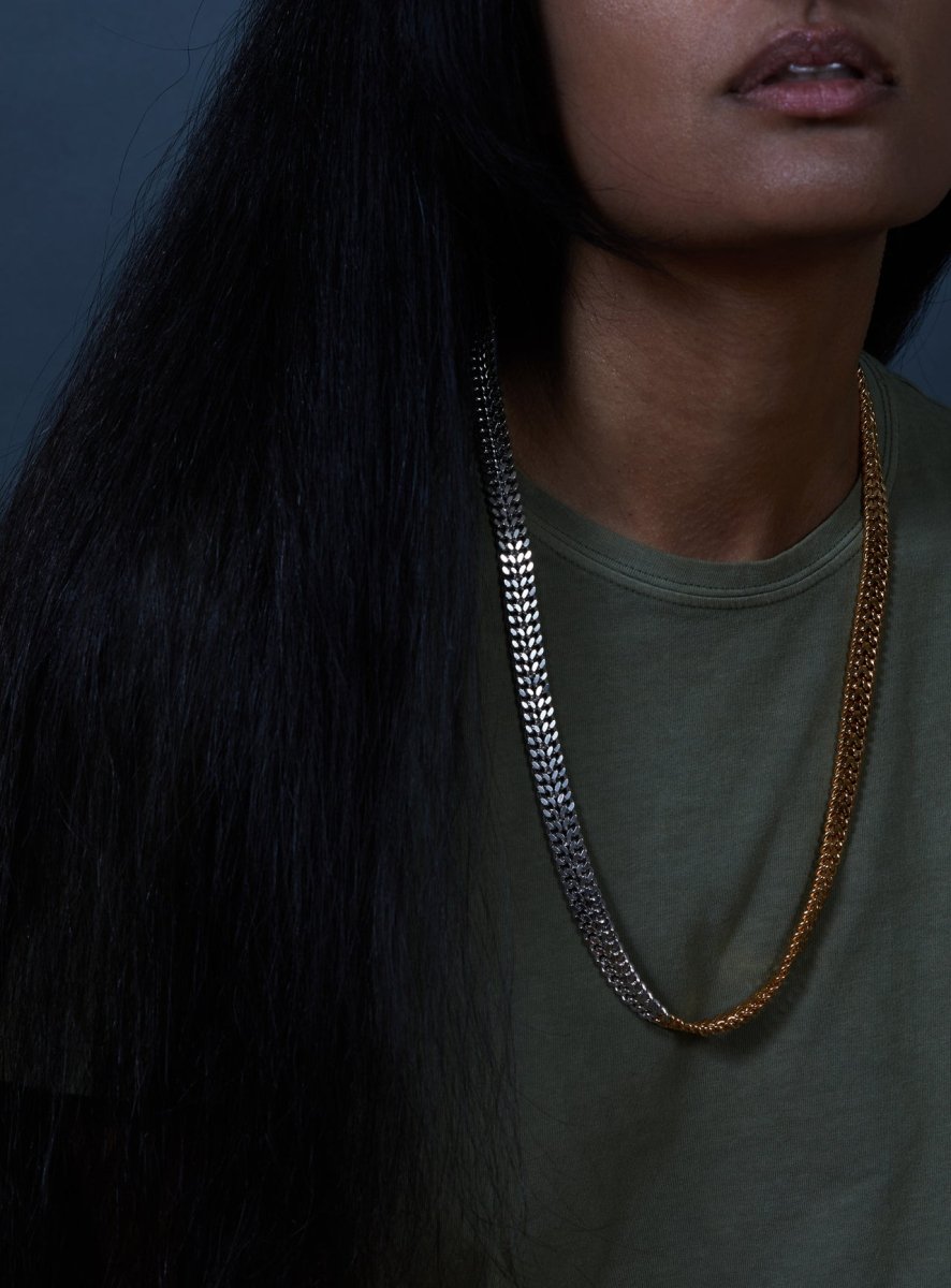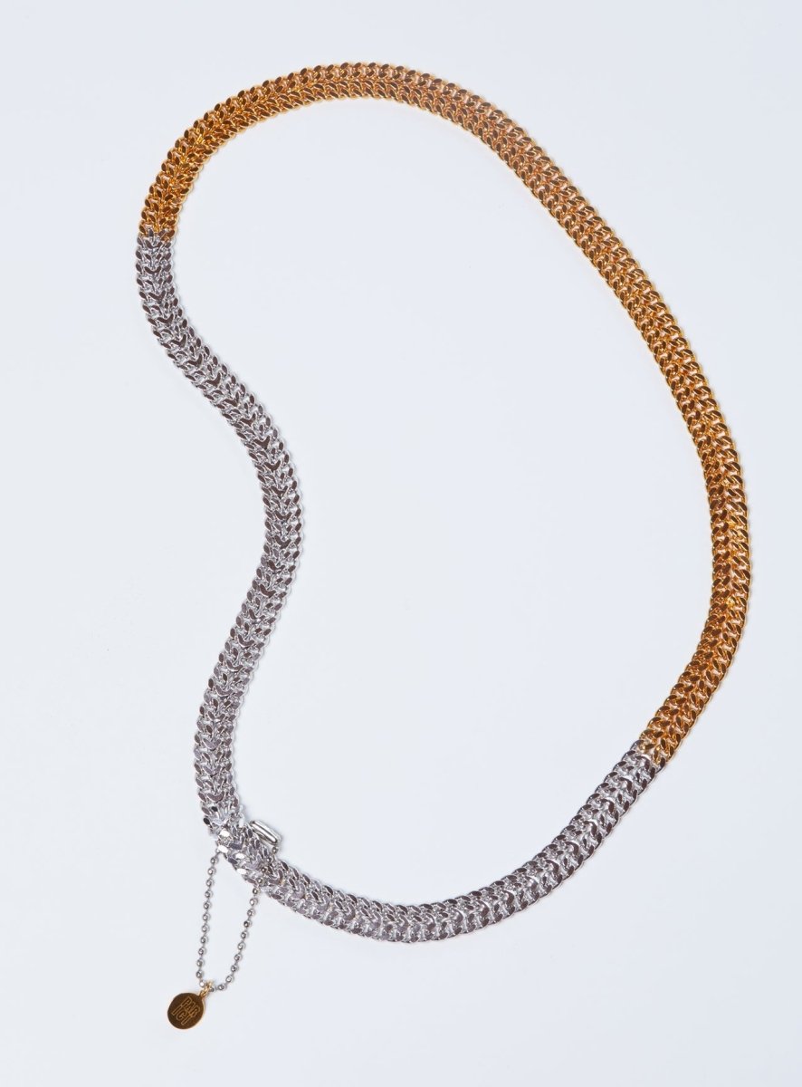 The 2Tone Double Wide Necklace is 22k gold and rhodium electroplated on solid brass.