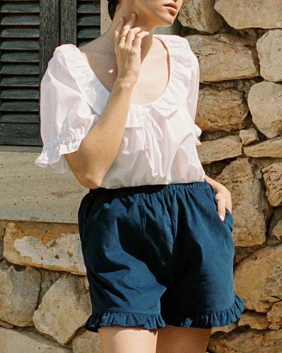 The Clémentine Shorts by Harly Jae are their take on vintage bloomers — reimagined for modern ease. Designed with a soft elastic waistband and a delicate ruffle hem, they strike the perfect balance between comfort and subtle femininity. The Clémentine Shorts features a slightly lower rise and have pockets!