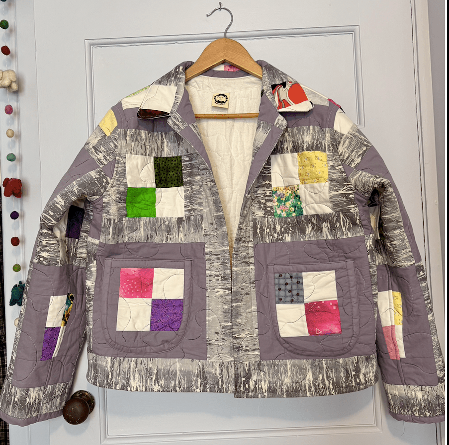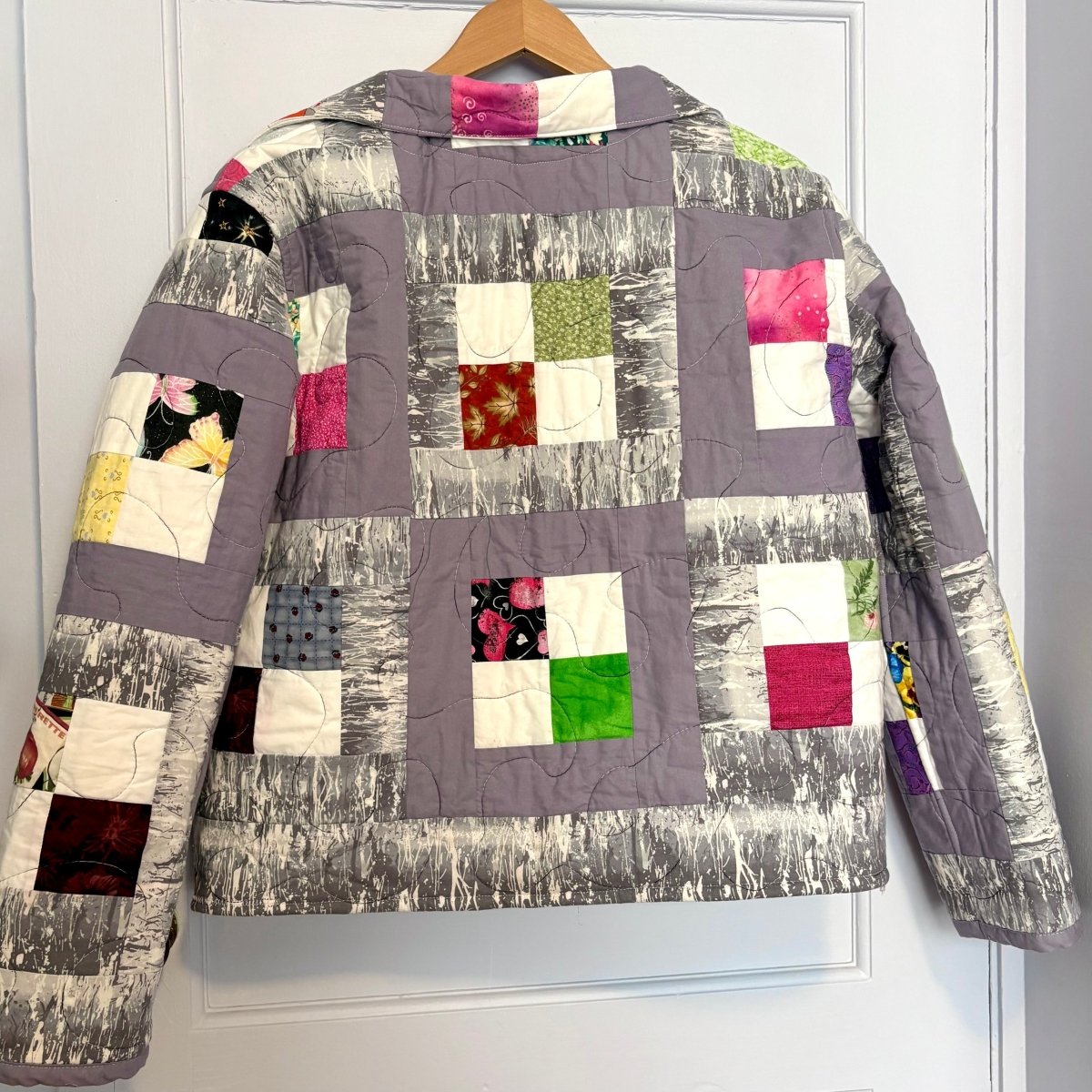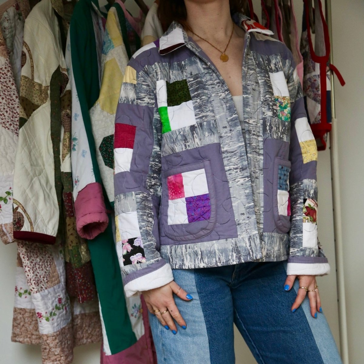 Collared chore coat made from a vintage quilt featuring patchwork squares on a pale purple and grey backdrop. Fits a size xs-m depending on desired fit. Antique brass snaps (not pictured-- added after photos taken).