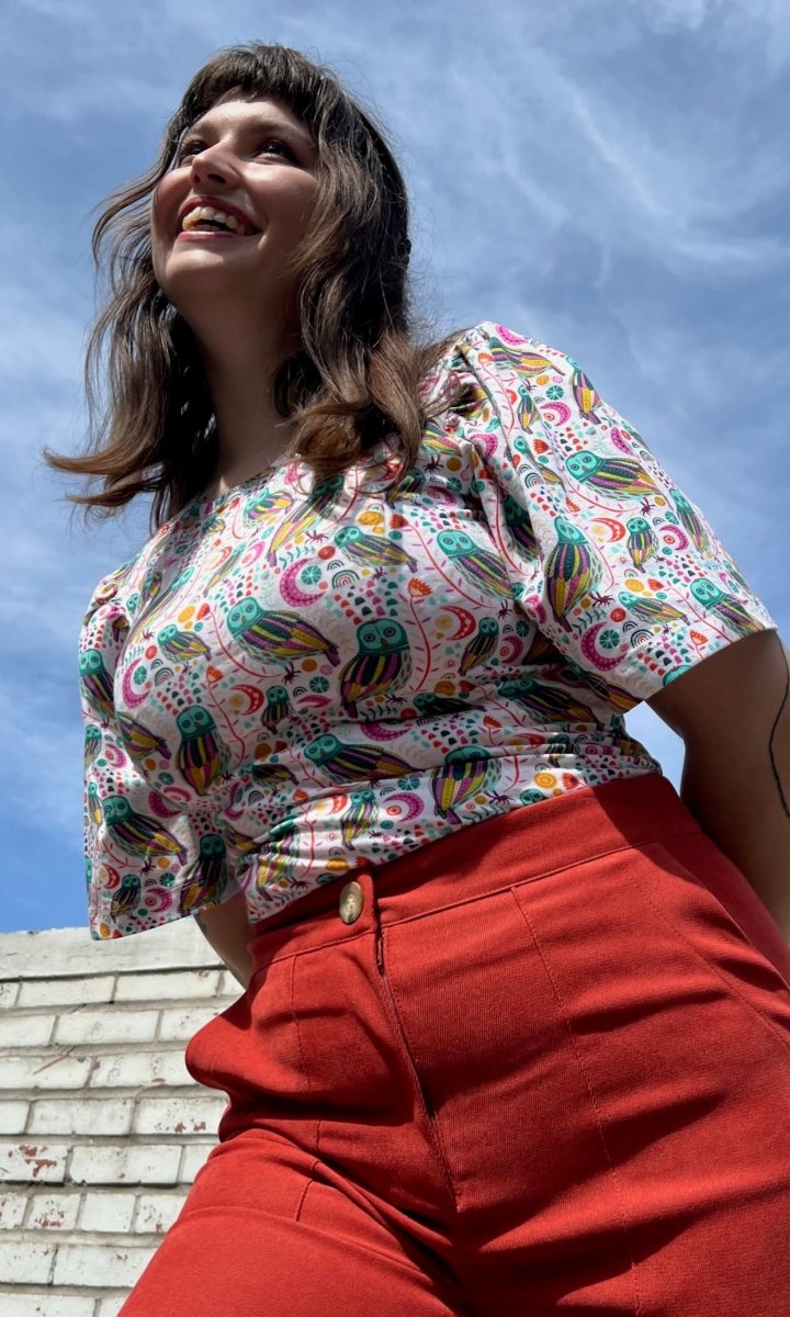The Peahen Top by Birds of North America is a crew-neck knit top with an elbow length full sleeve that is gathered at the shoulder. The fabric is a soft cotton jersey that is a cotton and spandex blend allowing for a good amount of stretch while maintaining comfort and shape. We love this print with it's beautifully illustrated multicoloured owls in the print, with abstract crescent moons, stars an flowers.